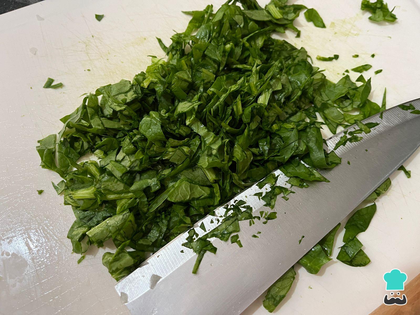 Pica la acelga previamente lavada. Para lavarla correctamente, sumérgela en una solución de agua con lavandina usando 1 gota de lavandina apta para alimentos por litro de agua. Pasados unos 15 minutos, retírala y escúrrela. Pícala cruda para usarla en el relleno de tus canelones de verdura y pollo.