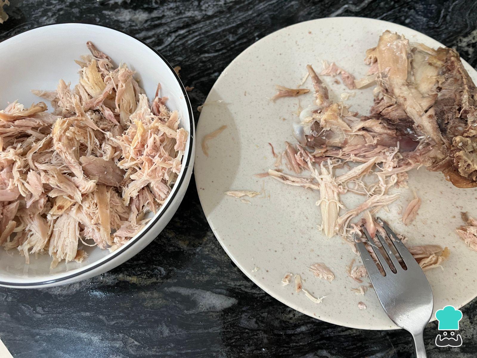 Cuando el pollo esté cocido, ayúdate con un tenedor para desmenuzarlo.