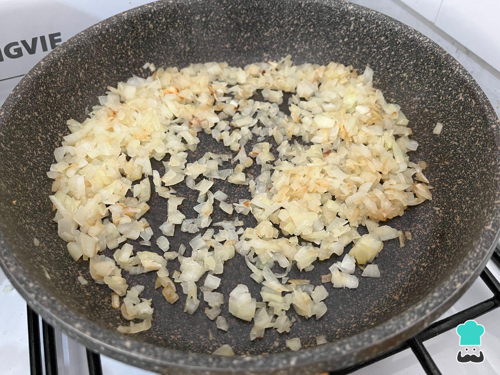 Pela y pica una cebolla para saltearla con 1 cucharada de aceite en la sartén. Si empieza a pegarse, agrega una cucharada de agua. Repite varias veces para que la cebolla se caramelice.