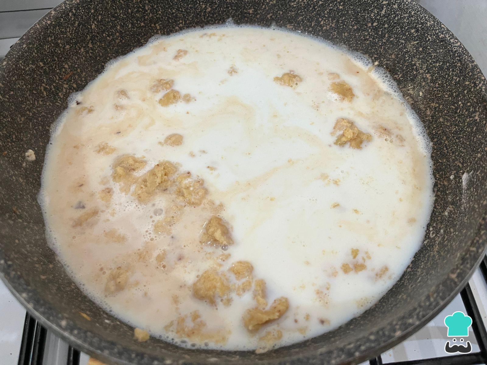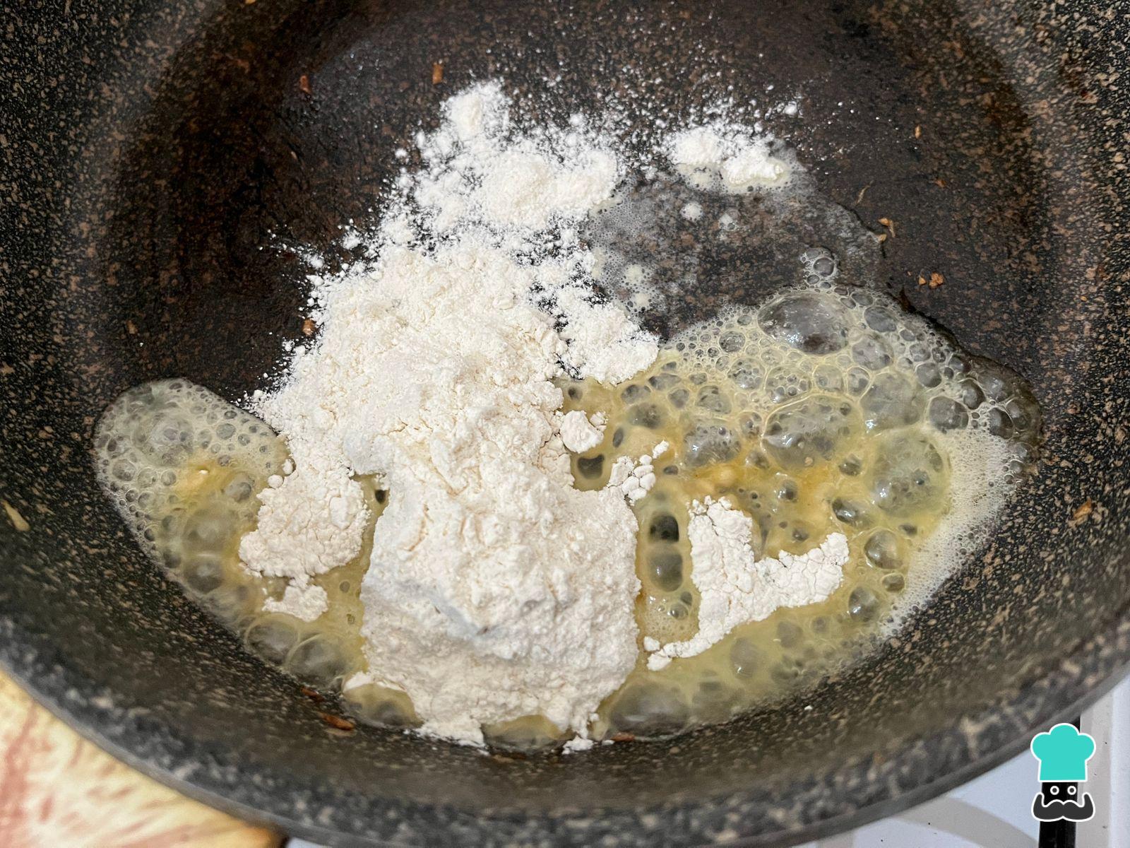 Cuando la cebolla esté caramelizada, retírala y agrega, en la misma sartén, la manteca con la harina. Deberás mezclar para que se integren y la harina de dore ligeramente.