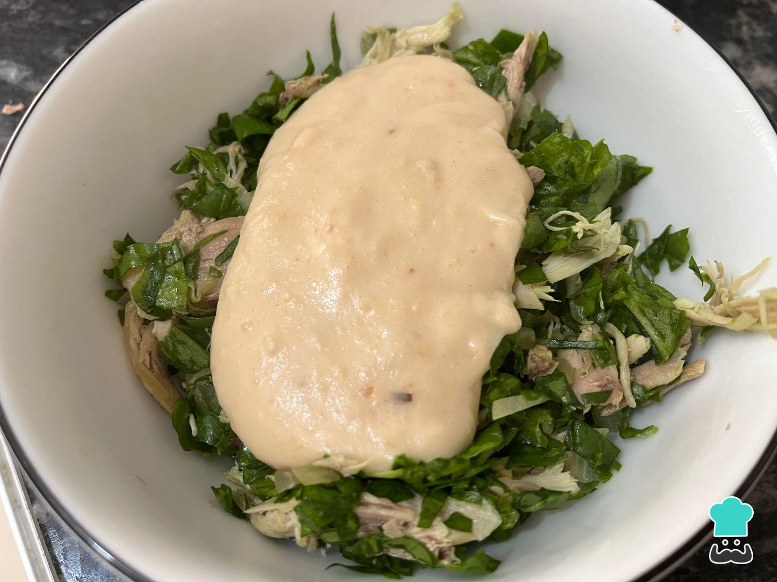 Retira la mitad de la salsa blanca bien espesa para mezclarla con la cebolla, la acelga picada y el pollo cocido desmenuzado. Condimenta al gusto con nuez moscada, ajo en polvo y pimienta.