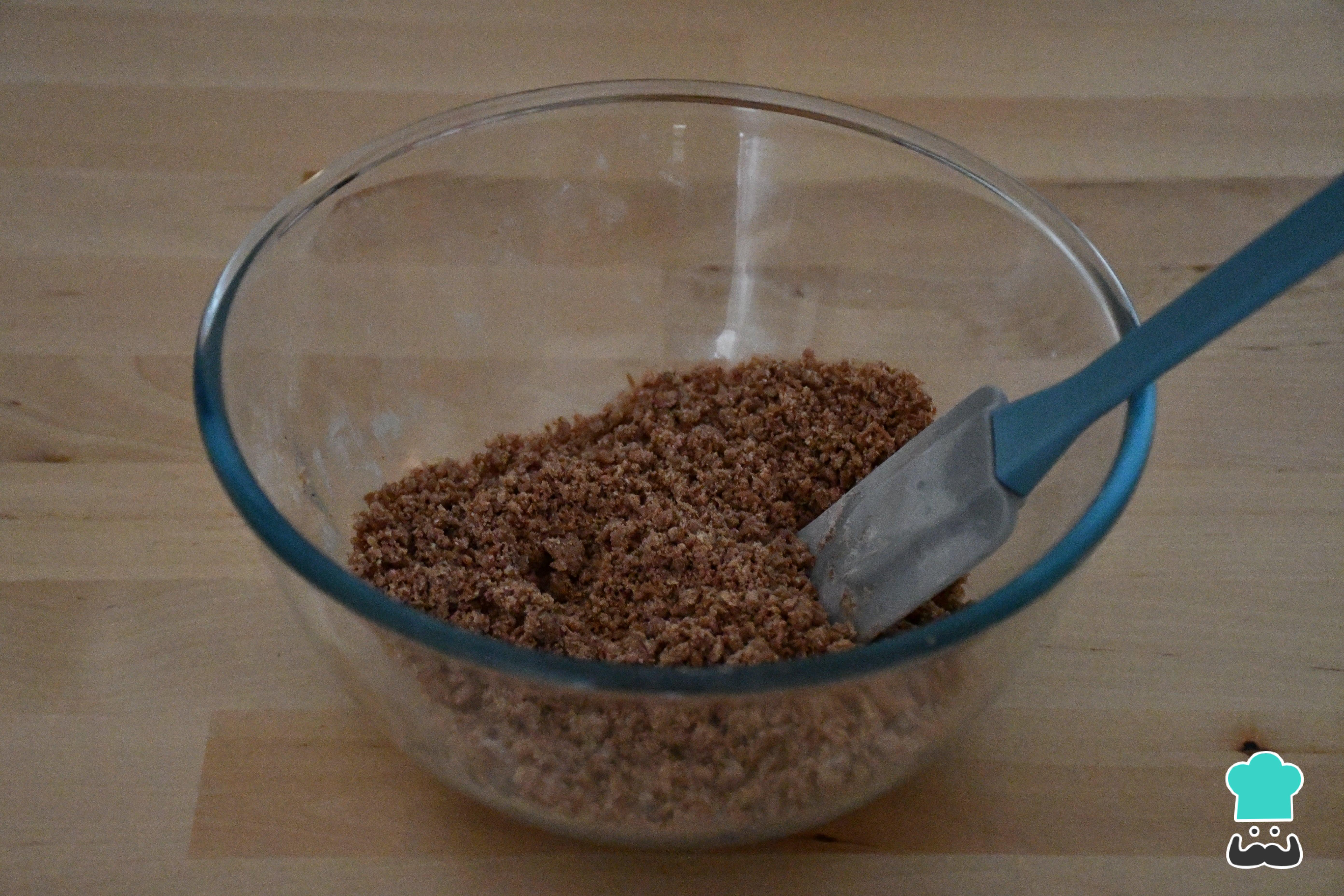 Mezcla bien los ingredientes: primero con ayuda de una espátula y después con las manos. Debe quedar una textura arenosa, como se observa en la imagen.