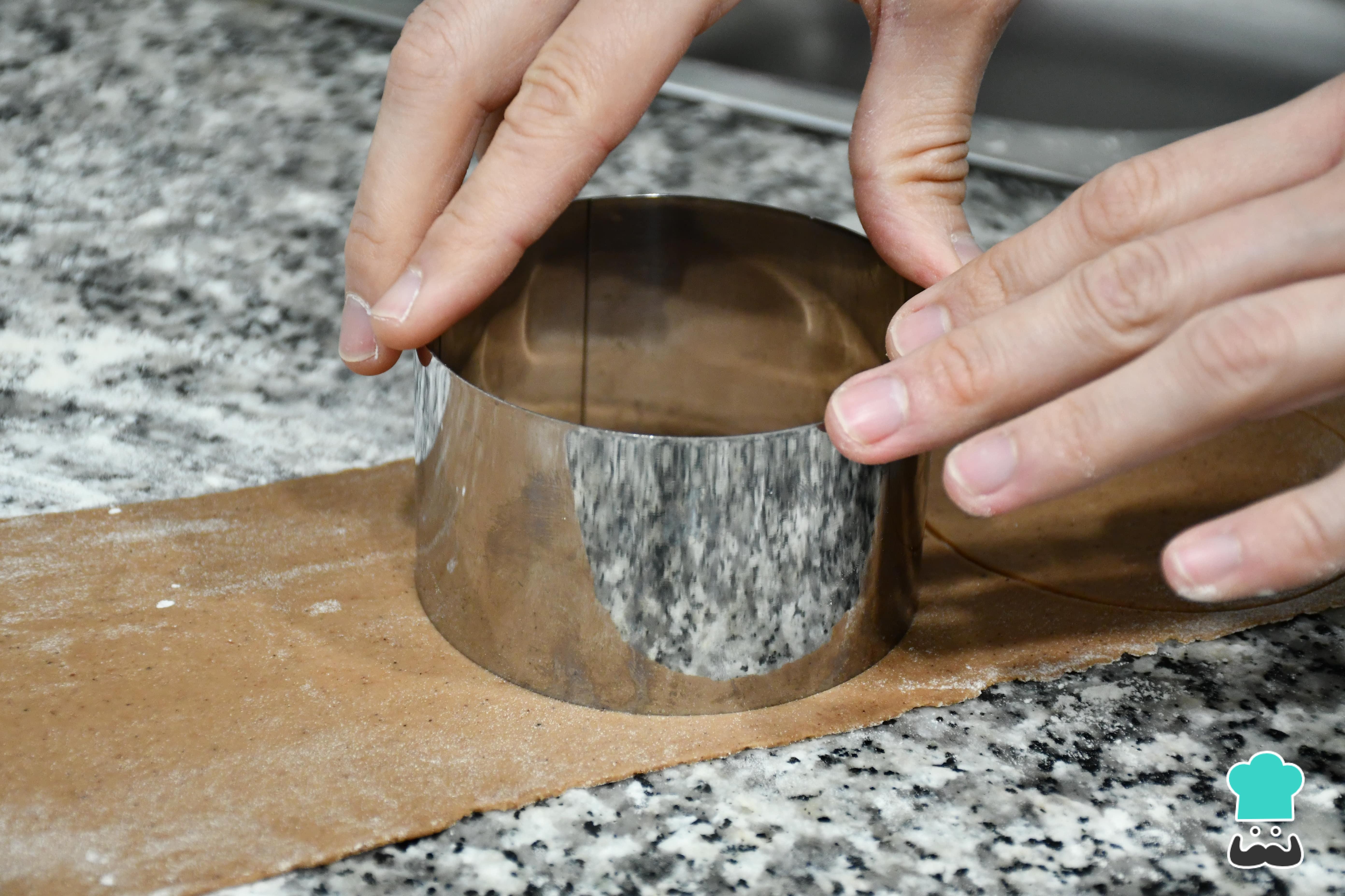 Divide la masa en dos y estírala con ayuda de un rodillo. Debe quedar muy fina, entre 1 y 2 milímetros de grosor. Con la ayuda de un molde redondo o un vaso, corta la masa en círculos.