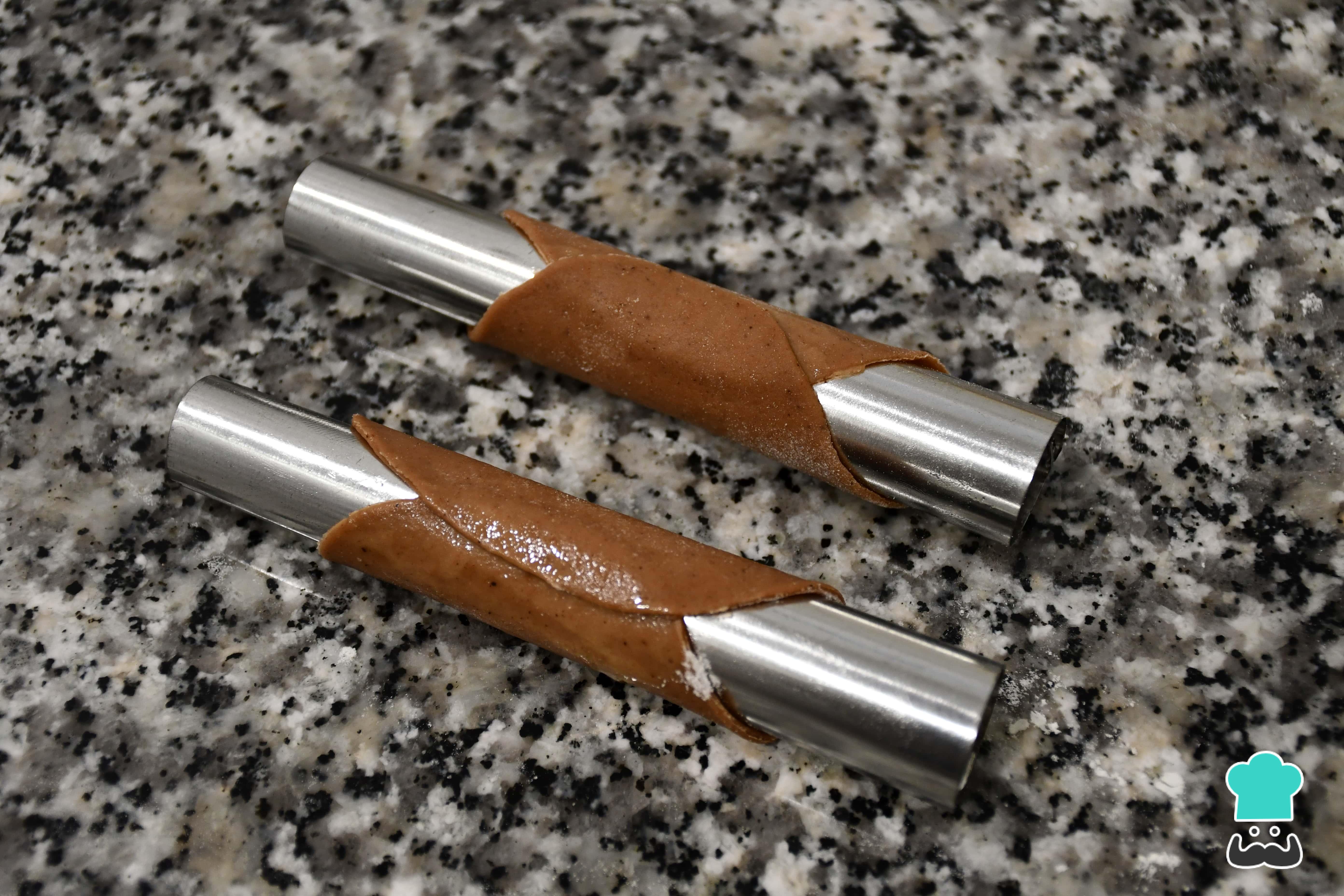 Coloca cada círculo de masa alrededor de un molde cilíndrico para hacer la forma del cannolo, pegando un extremo con otro pintándolo con huevo batido.