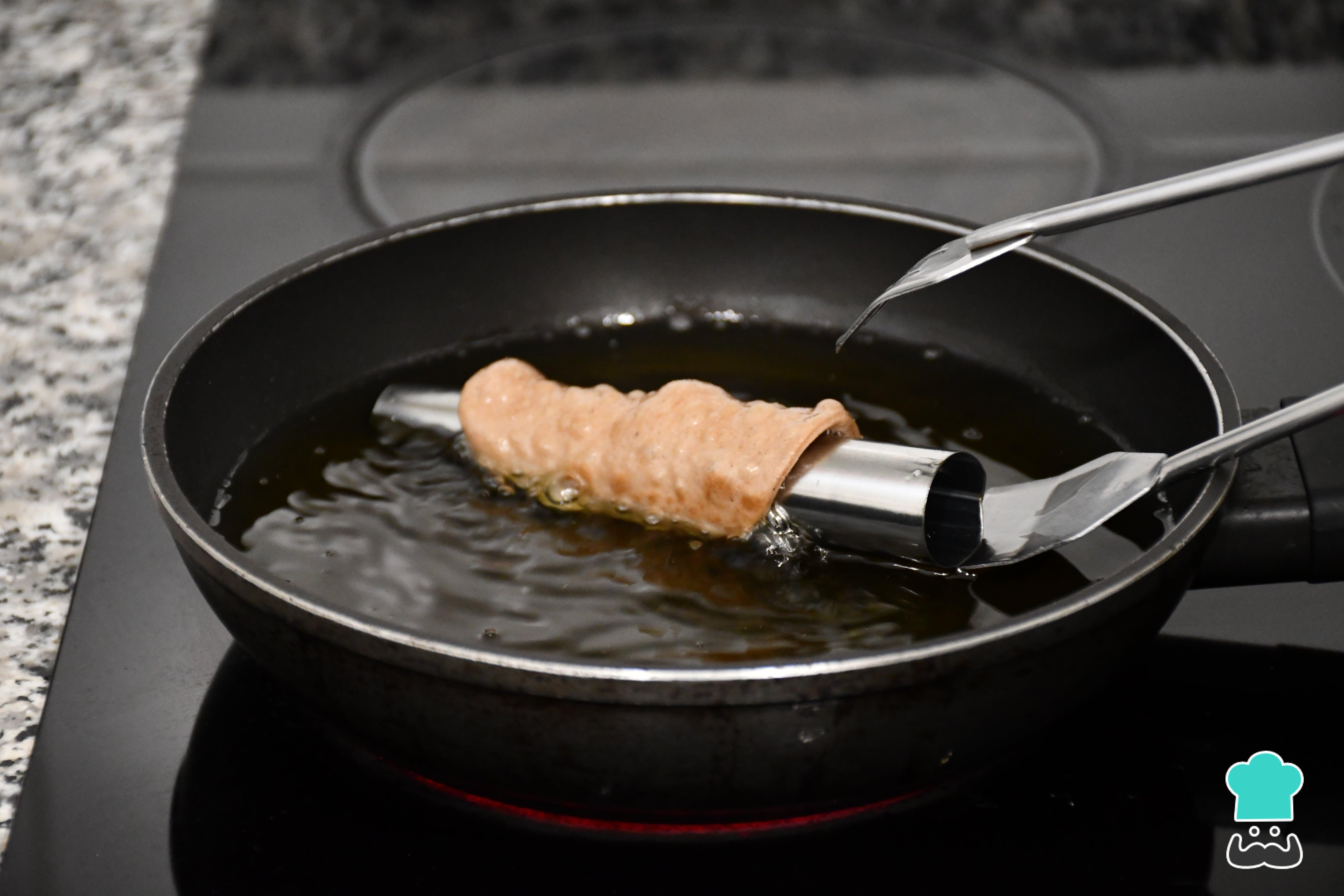 Fríe los cannolis en abundante aceite caliente. A medida que se fríen ve moviéndolos para que no se quemen. Cuando estén dorados, escúrrelos bien en una bandeja con papel absorbente.