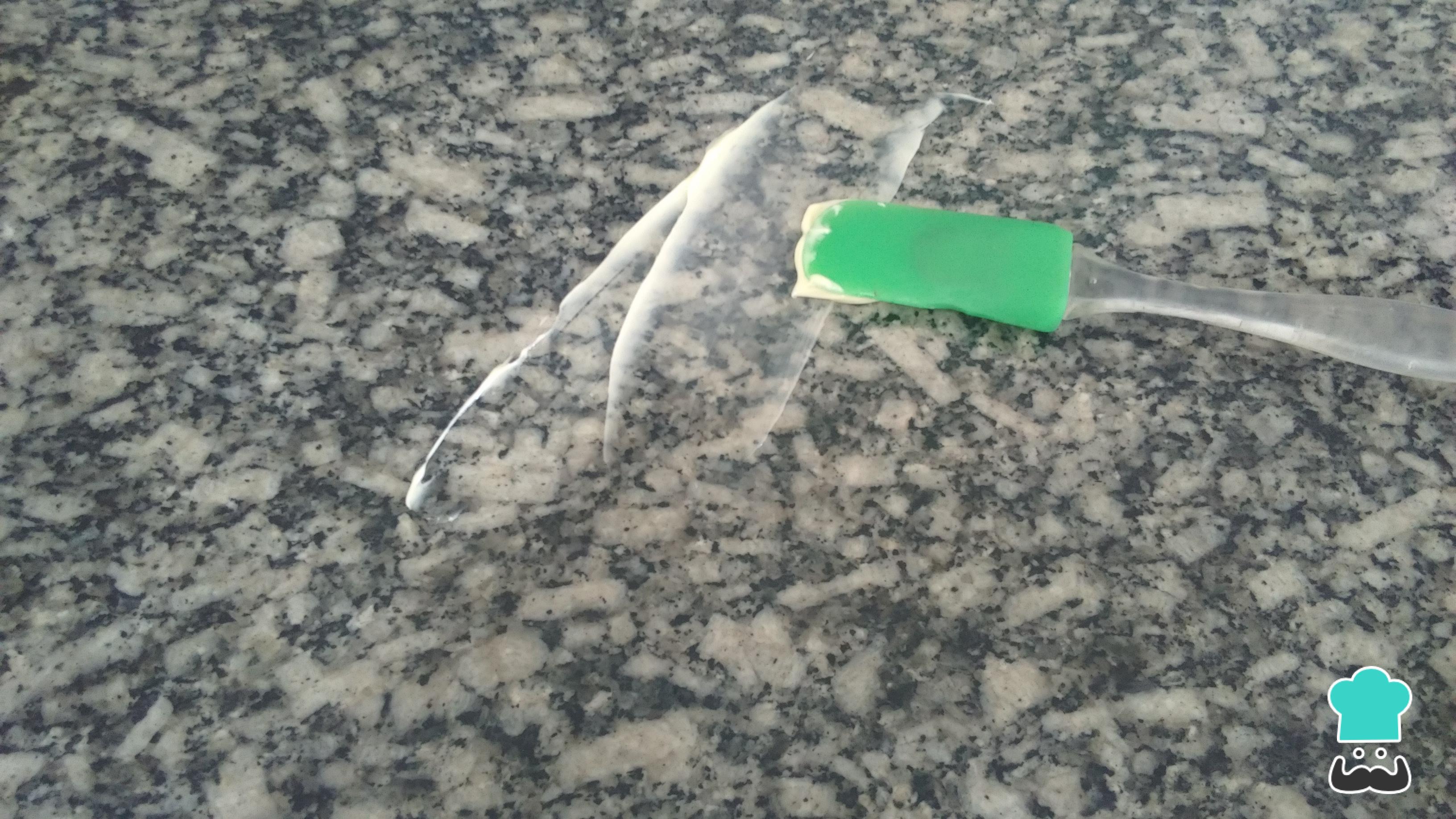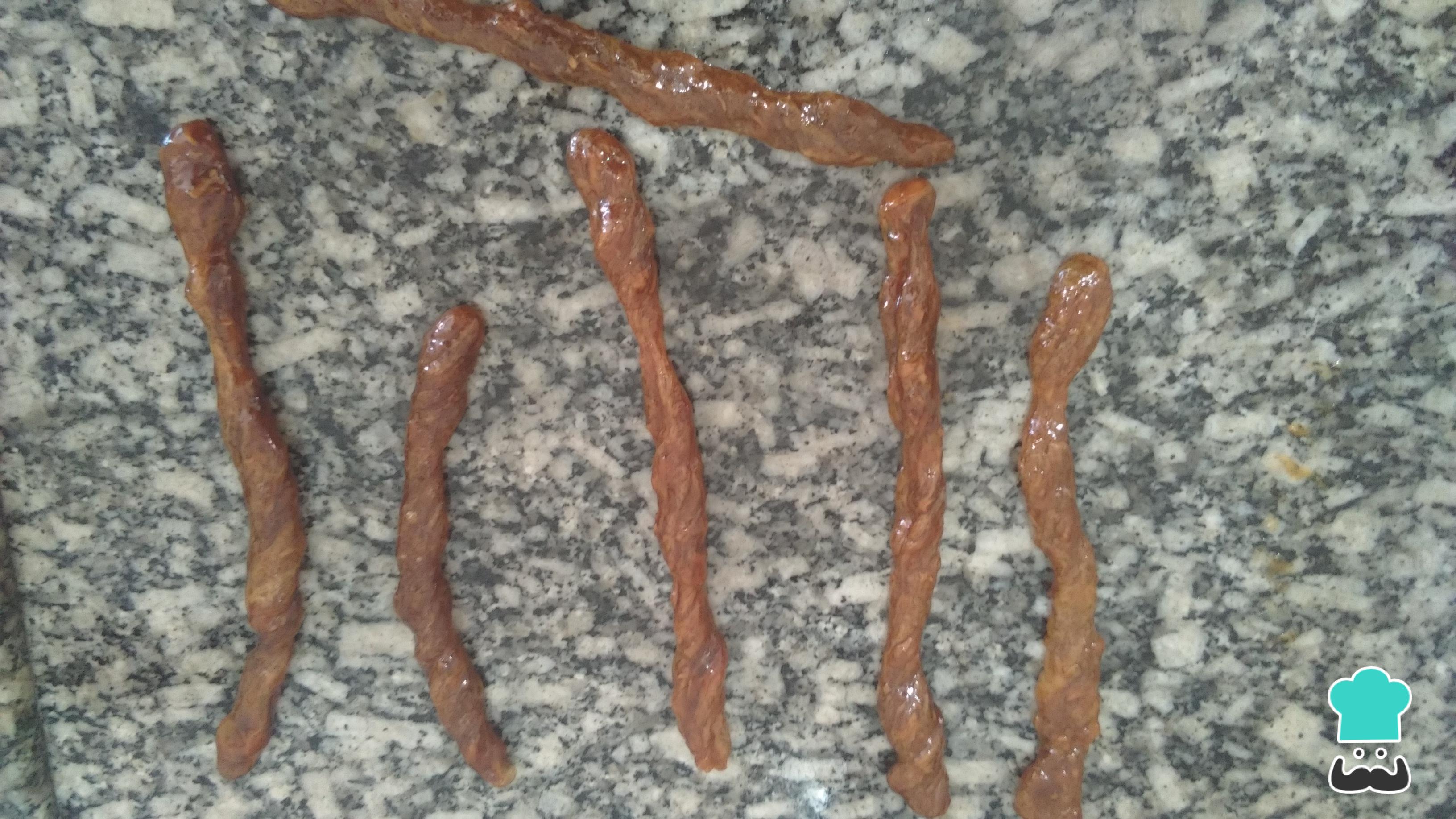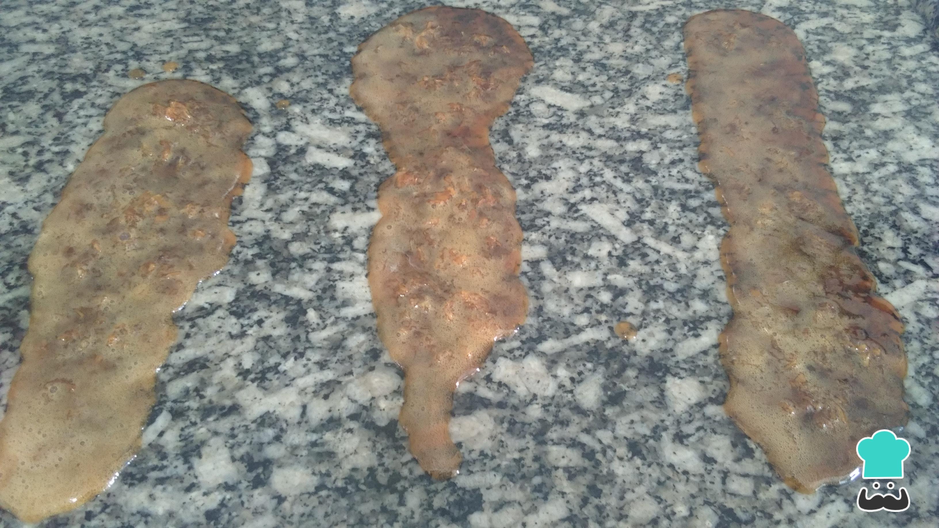 El caramelo enfría bastante rápido. Cuando alcance una temperatura que puedas manipular, dobla las tiras en tres partes y luego estírala con las manos hasta formar unos cordones de caramelo.