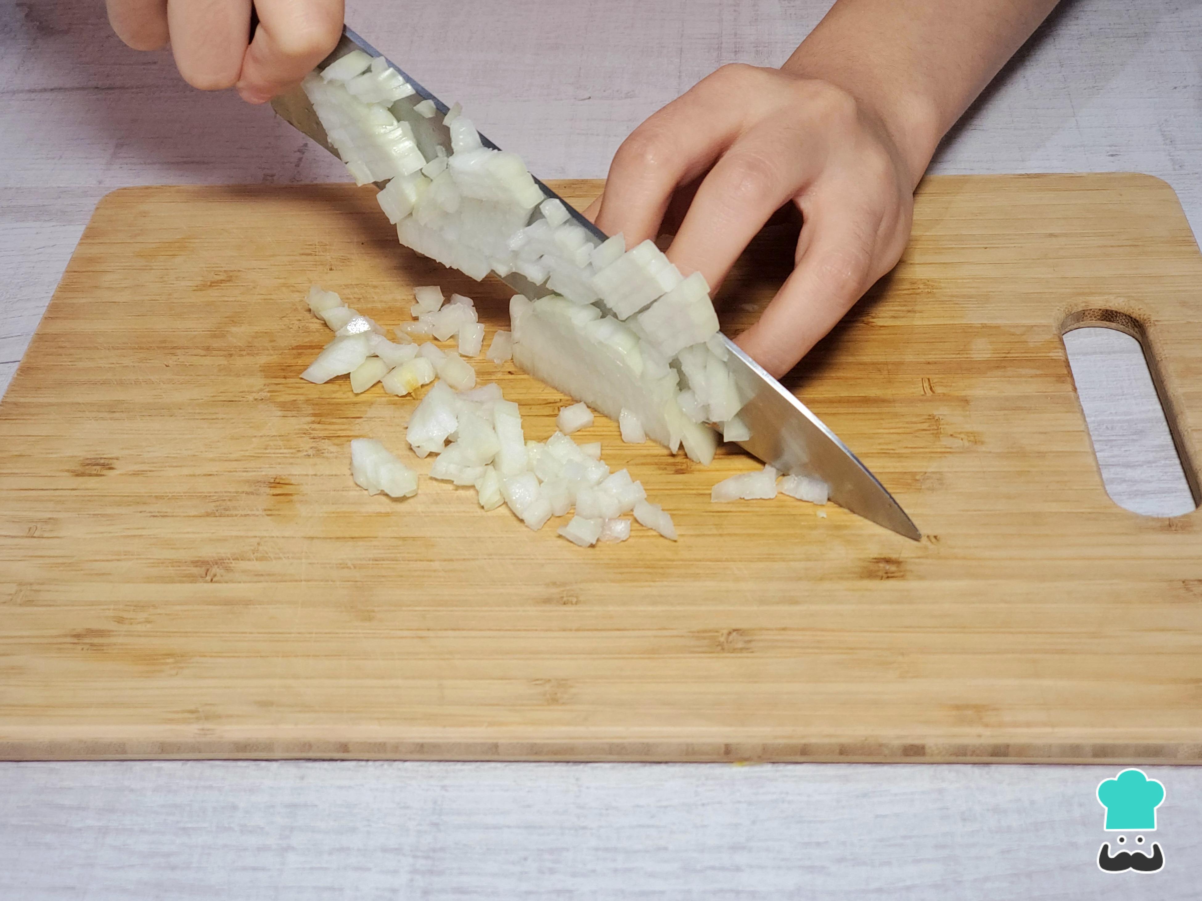 Comienza picando la cebolla que usarás para el aderezo y resérvala.