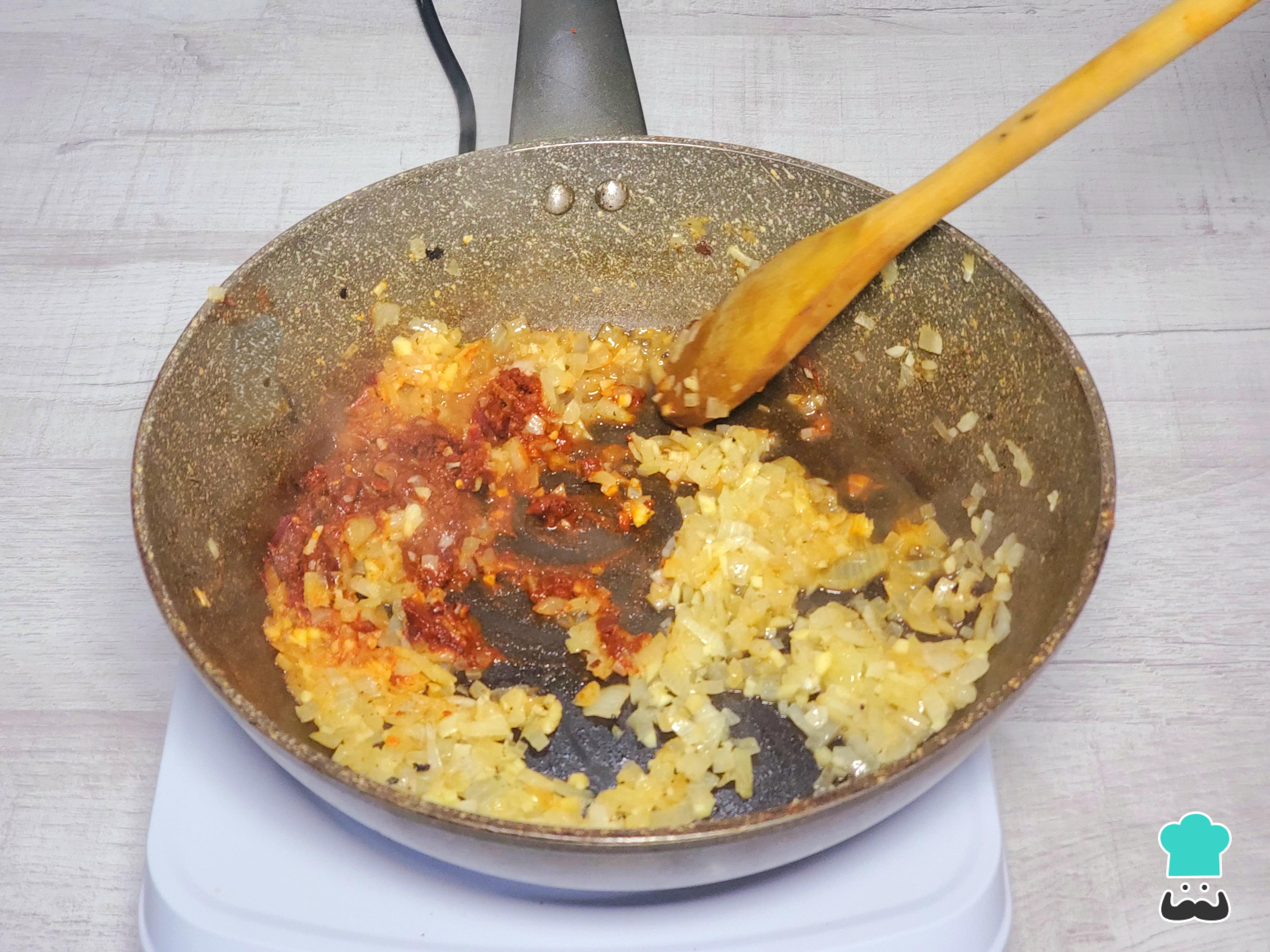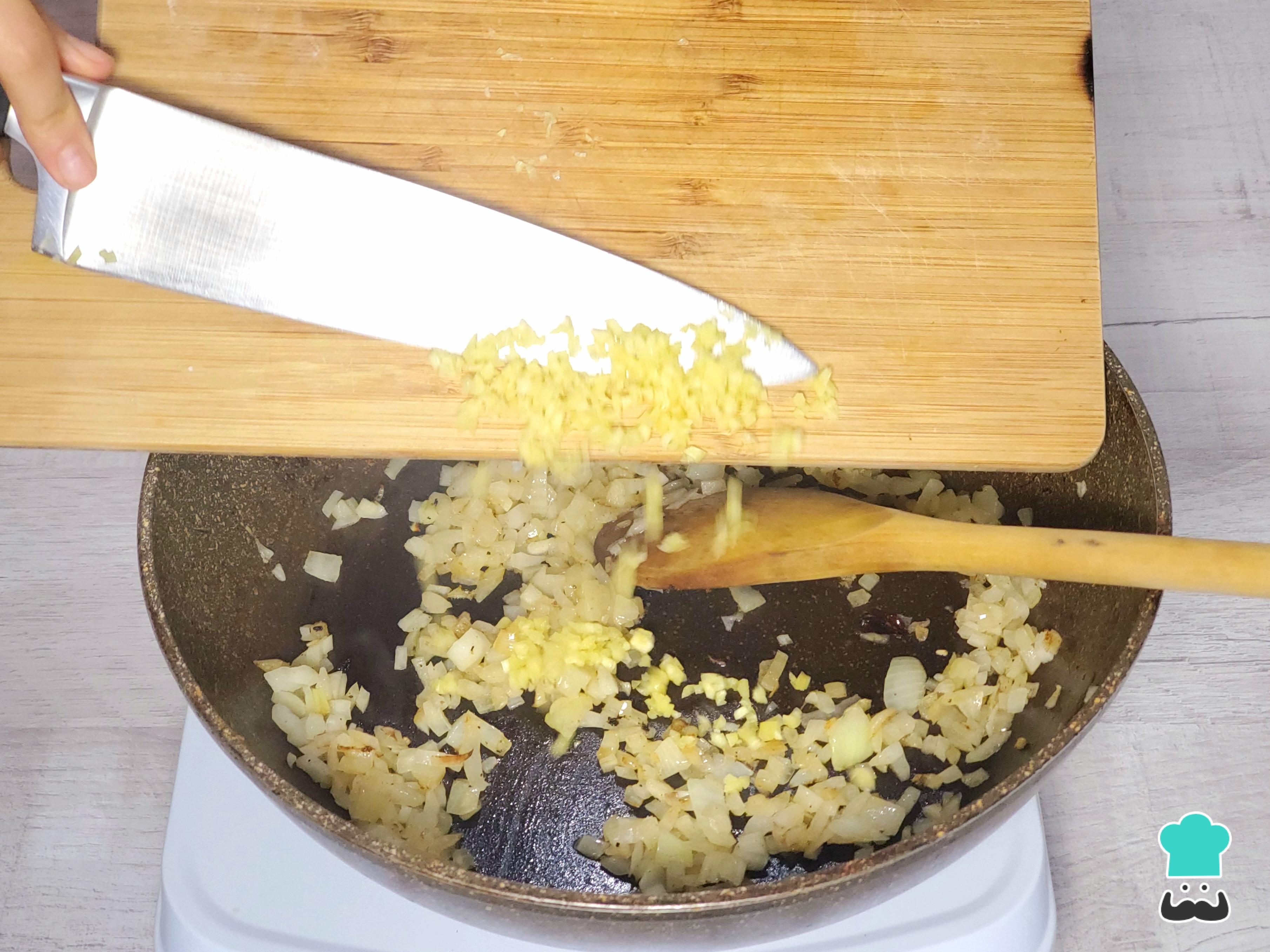 En la misma olla añade otro poco de aceite e incorpora la cebolla picada. Remueve por un par de minutos hasta que se vea translúcida o ligeramente caramelizada, permitiendo que absorba los sabores del fondo.