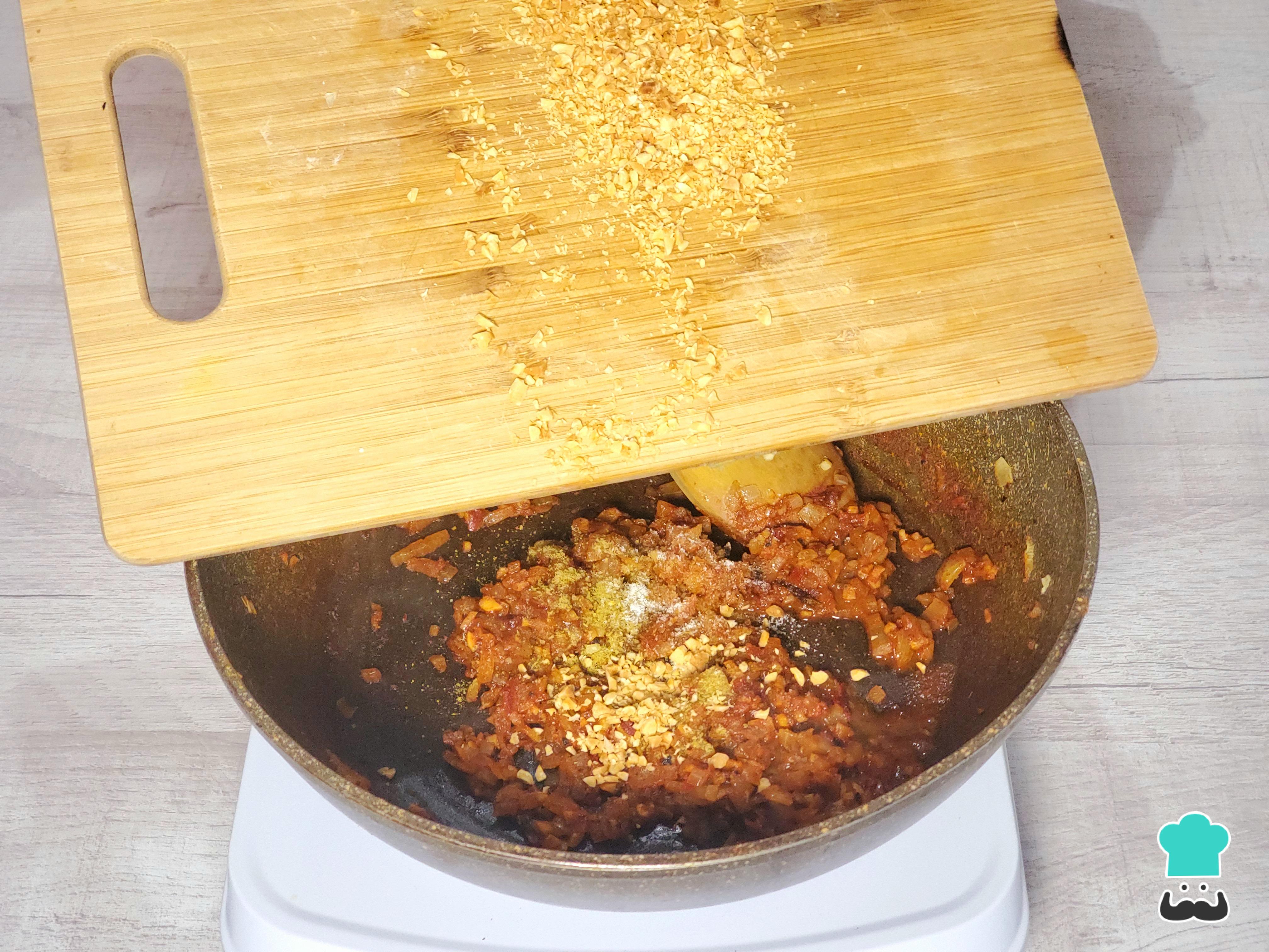 Agrega el ajo, la pasta de ají panca y las especias: comino, pimienta molida, rama de canela, hojas de laurel y sal. Mezcla bien y deja que se cocine a fuego lento por unos 40 minutos removiendo esporádicamente y agregando cucharones de caldo de pollo para evitar que el aderezo se seque o se queme. La consistencia ideal es la de una mermelada.