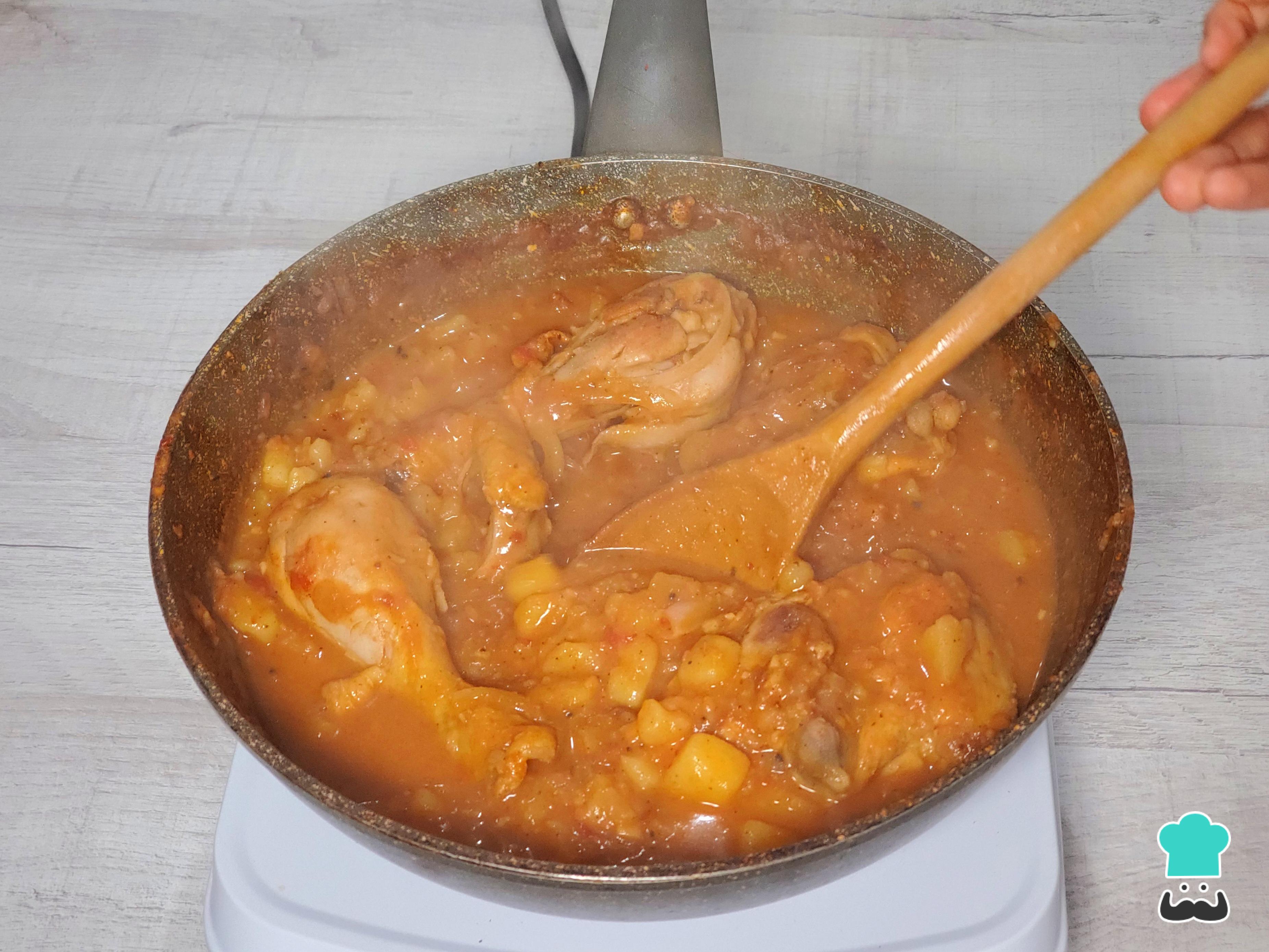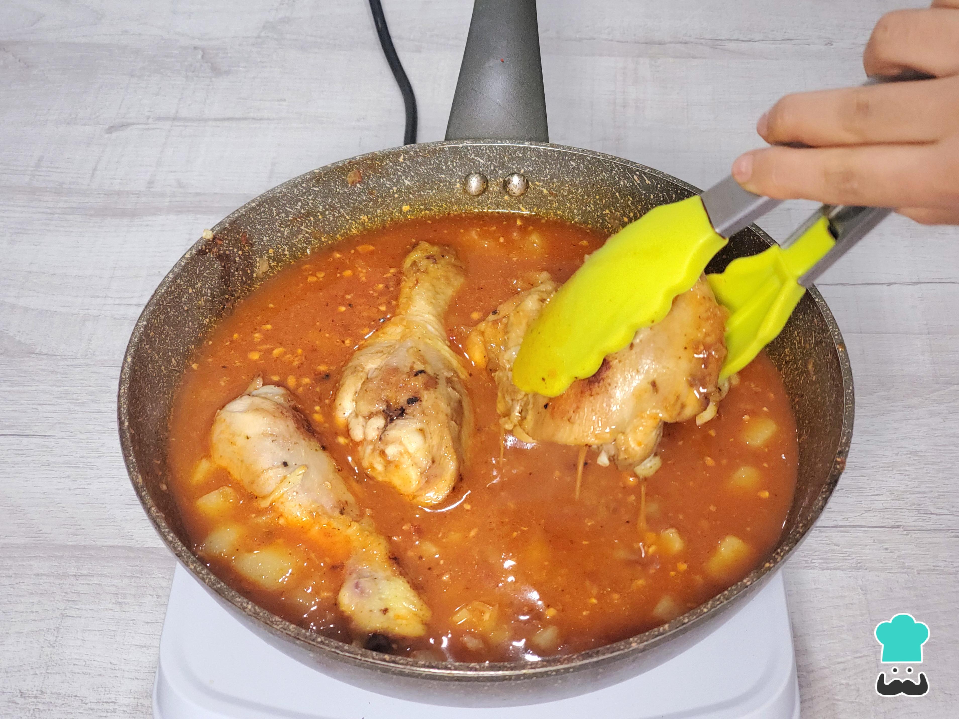 Agrega la papa seca previamente hidratada y las piezas de pollo doradas, cubre con caldo de pollo.