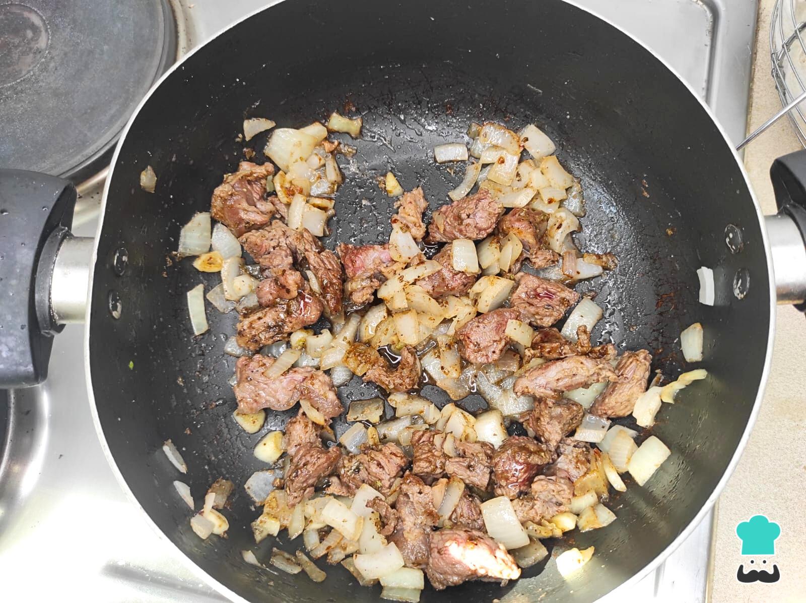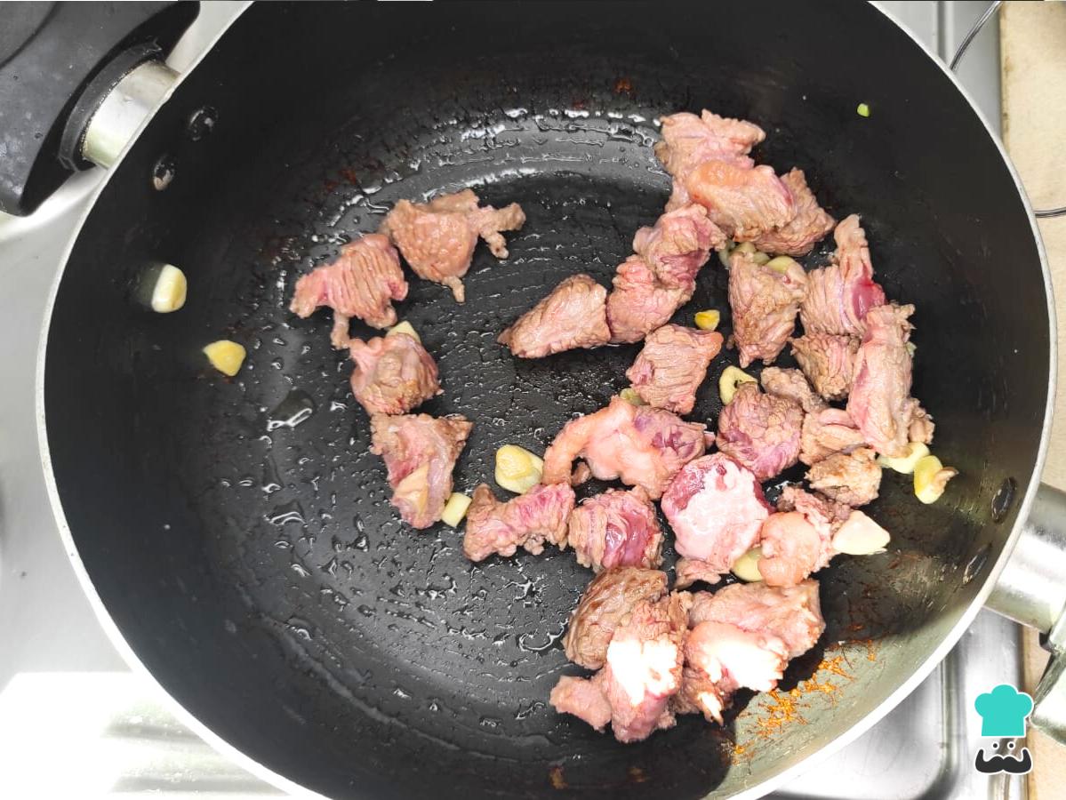 Calienta el aceite en una olla y agrega el ajo y la carne para sellarla por todos lados.