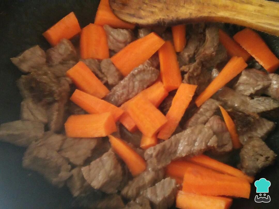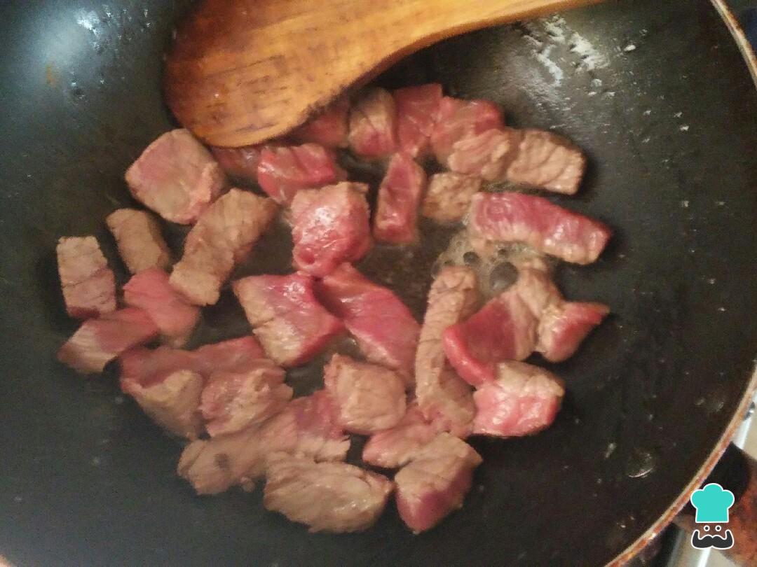 Pica la carne y sofríela en una sartén con un poco de aceite.