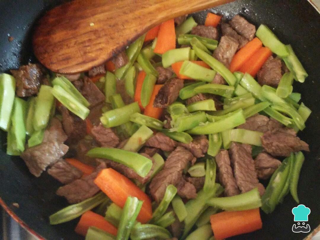 Agrega los porotos verdes cortados en trozos pequeños a la sartén y sigue salteando las verduras con carne.