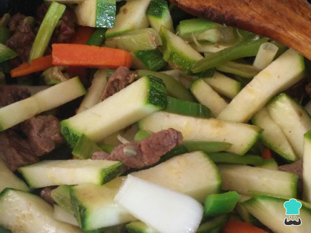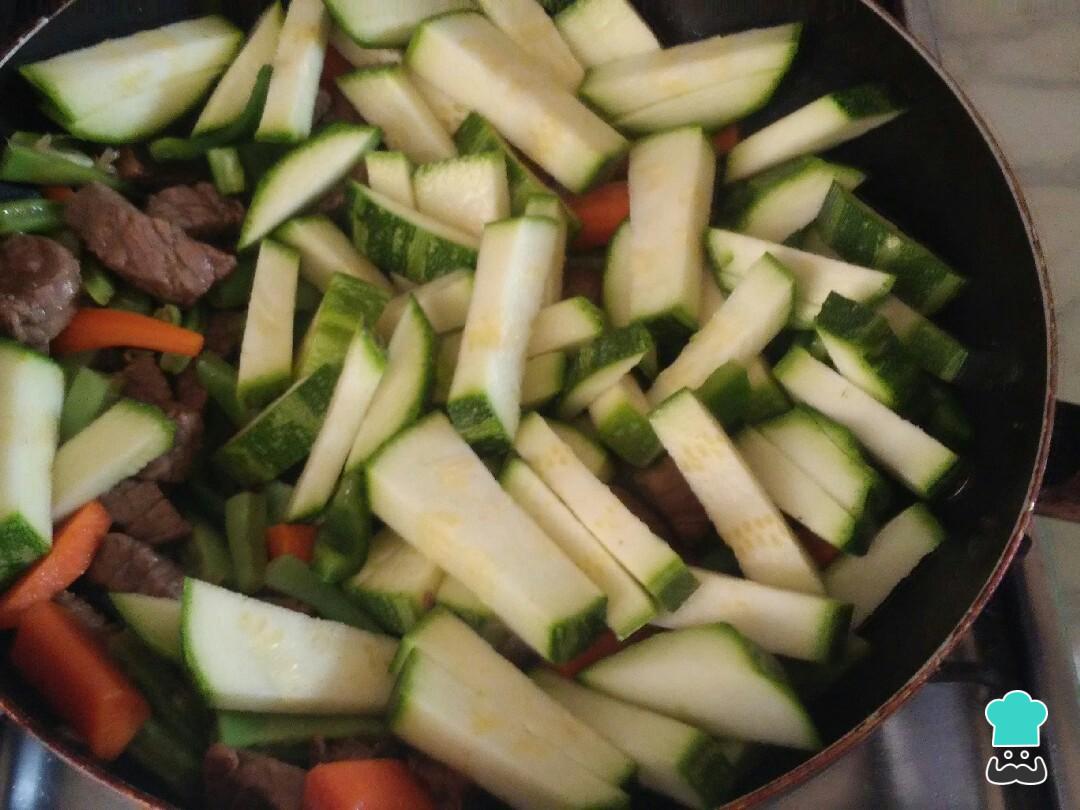 Agrega el zapallo italiano cortado el trozos con la salsa de soja, remueve y sigue friendo.