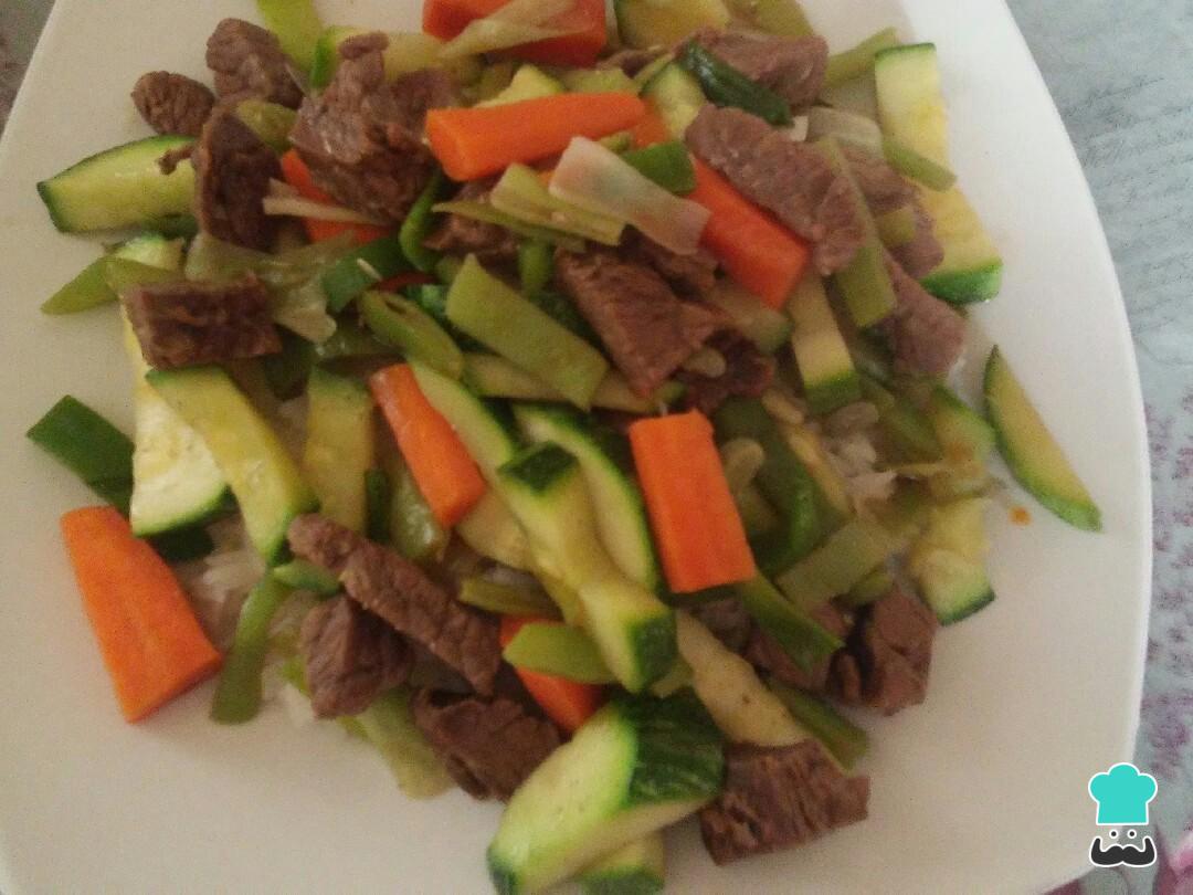 ¿Qué se pone primero la carne o las verduras? Como comprobarás en esta receta que nos ha compartido Jessicaloyola desde la app de RecetasGratis, se saltea la carne primero y después los vegetales. Sigue leyendo los ingredientes y los pasos y verás qué fácilmente puedes elaborar esta receta de carne con verduras salteadas con un toque de salsa de soja bien sabroso. Además, modifica los ingredientes a tu gusto y añade el tipo de carne o vegetales que más se te antojen.