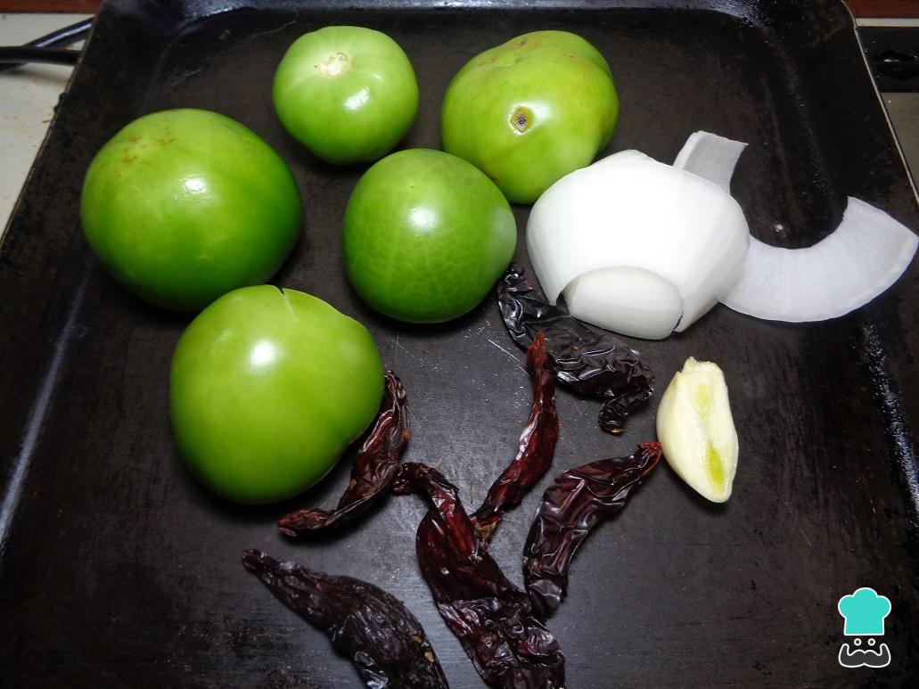 Vamos a comenzar nuestra preparacion la receta con chile morita asando las ingredientes de nuestra salsa de mora: para esto colocamos sobre la plancha caliente los tomates, los chiles moritas, el ajo y la cebolla y dejamos que se asen muy bien hasta que se observen ligeramente quemados.