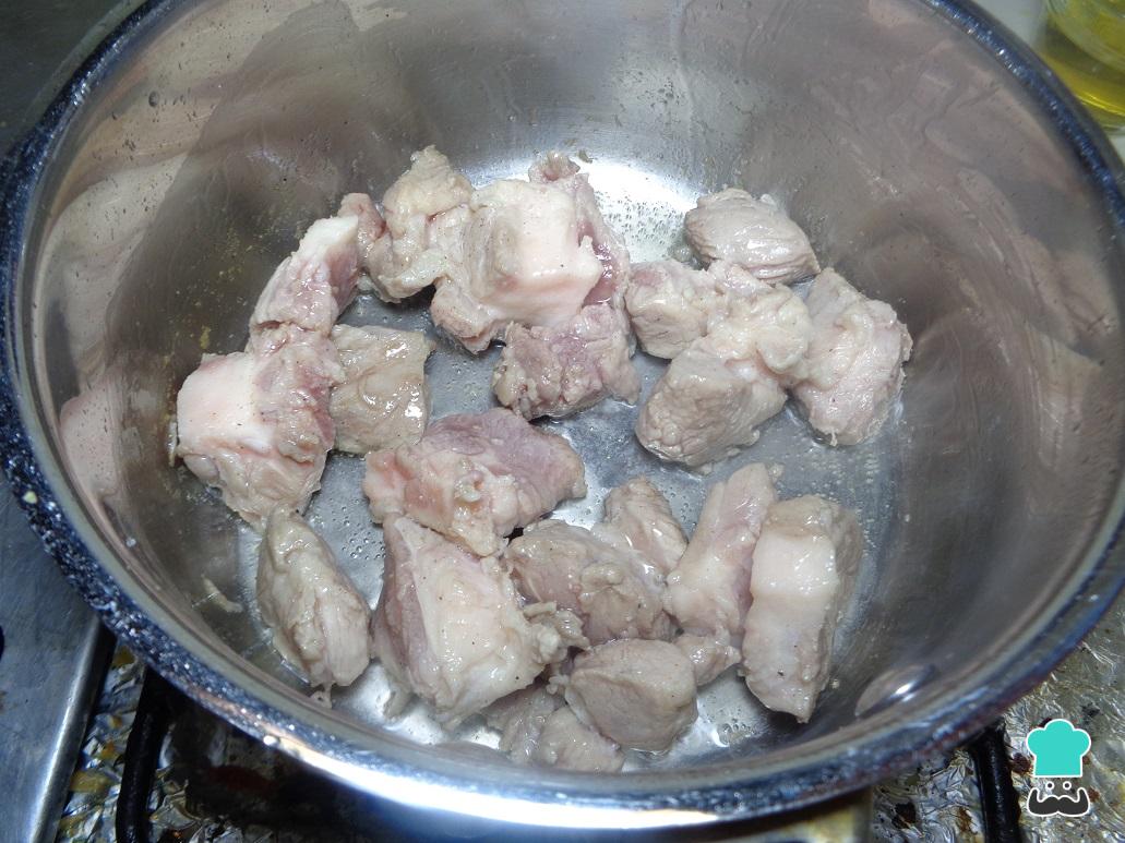 Mientras tanto tomamos la carne de puerco, la cortamos en pequeños cubos de aproximadamente 2 cm de cada lado y la colocamos a freír en una cacerola con aceite previamente calentado. Dejamos que se fría a fuego medio hasta que esté dorada la carne.