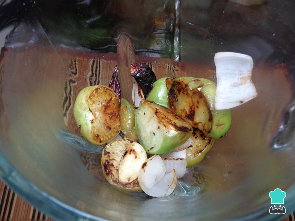Una vez listos, los ingredientes de la salsa mora, los retiramos de la plancha caliente y los colocamos en la licuadora, entonces procedemos a mezclar hasta obtener una salsa homogénea para la receta con chile morita.