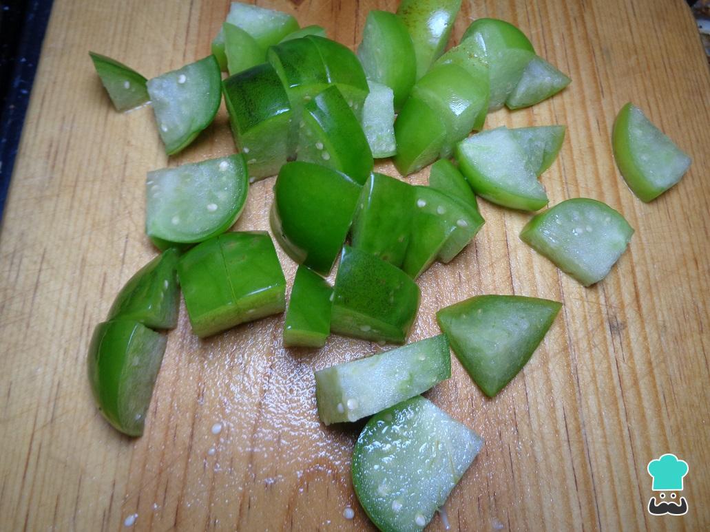 Mientras tanto tomamos los tomates verdes, los lavamos perfectamente bien, y comenzamos a rebanarlos en pequeños trozos como los que podemos observar en la siguiente imagen.