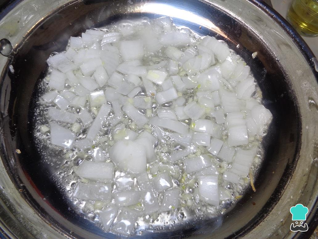 Ahora en una cacerola con aceite previamente calentado añadimos la cebolla finamente picada y dejamos que se sofría.