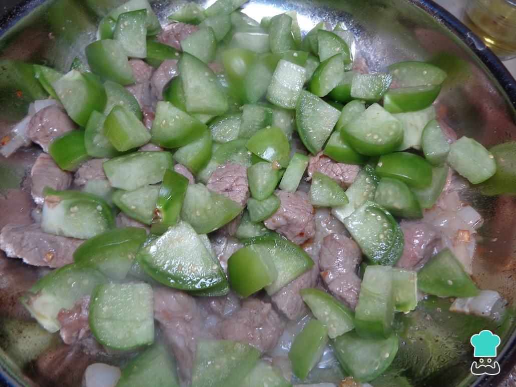 Pasados 7 minutos, añadimos los trozos de tomate verde que rebanamos hace un momento a la carne, y dejamos que se frían juntos lo que resta de tiempo.