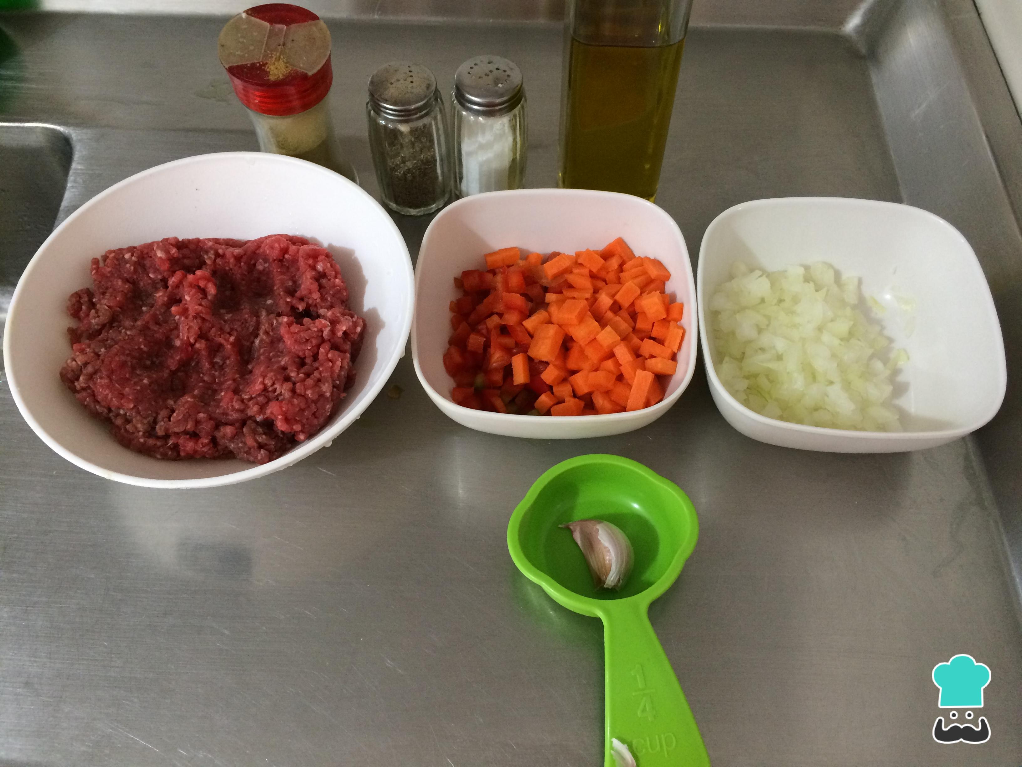 Para preparar esta receta de carne molida, comienza alistando todos los ingredientes. Corta la zanahoria, los pimientos y las cebollas en cubitos y pedacitos pequeños.
