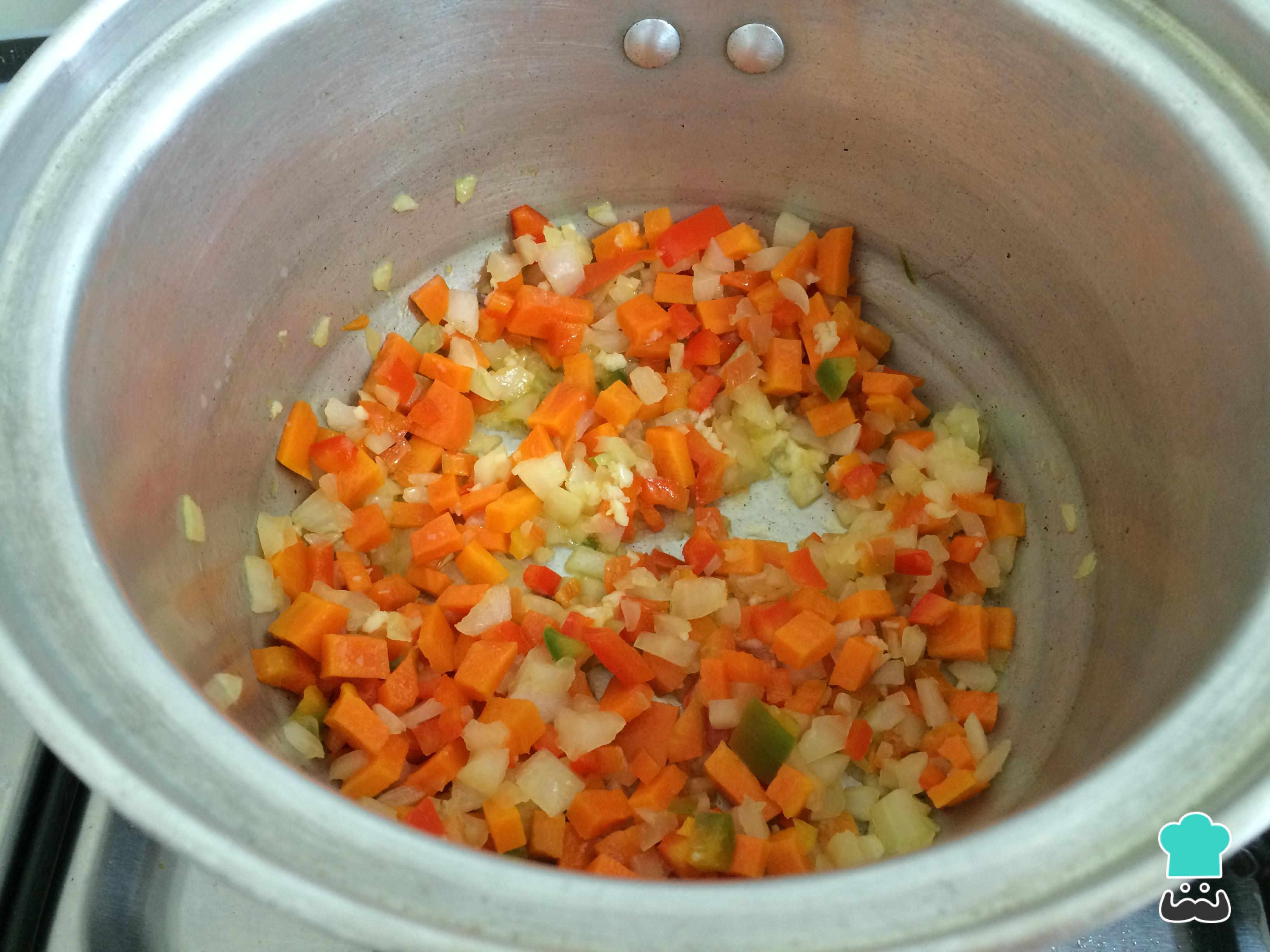 En una olla, prepara un sofrito de verduras. Primero, sofríe la cebolla, el pimiento y la zanahoria hasta que estén blandos todos los ingredientes. Agrega el ajo finamente picado y sofríe por un minuto más.