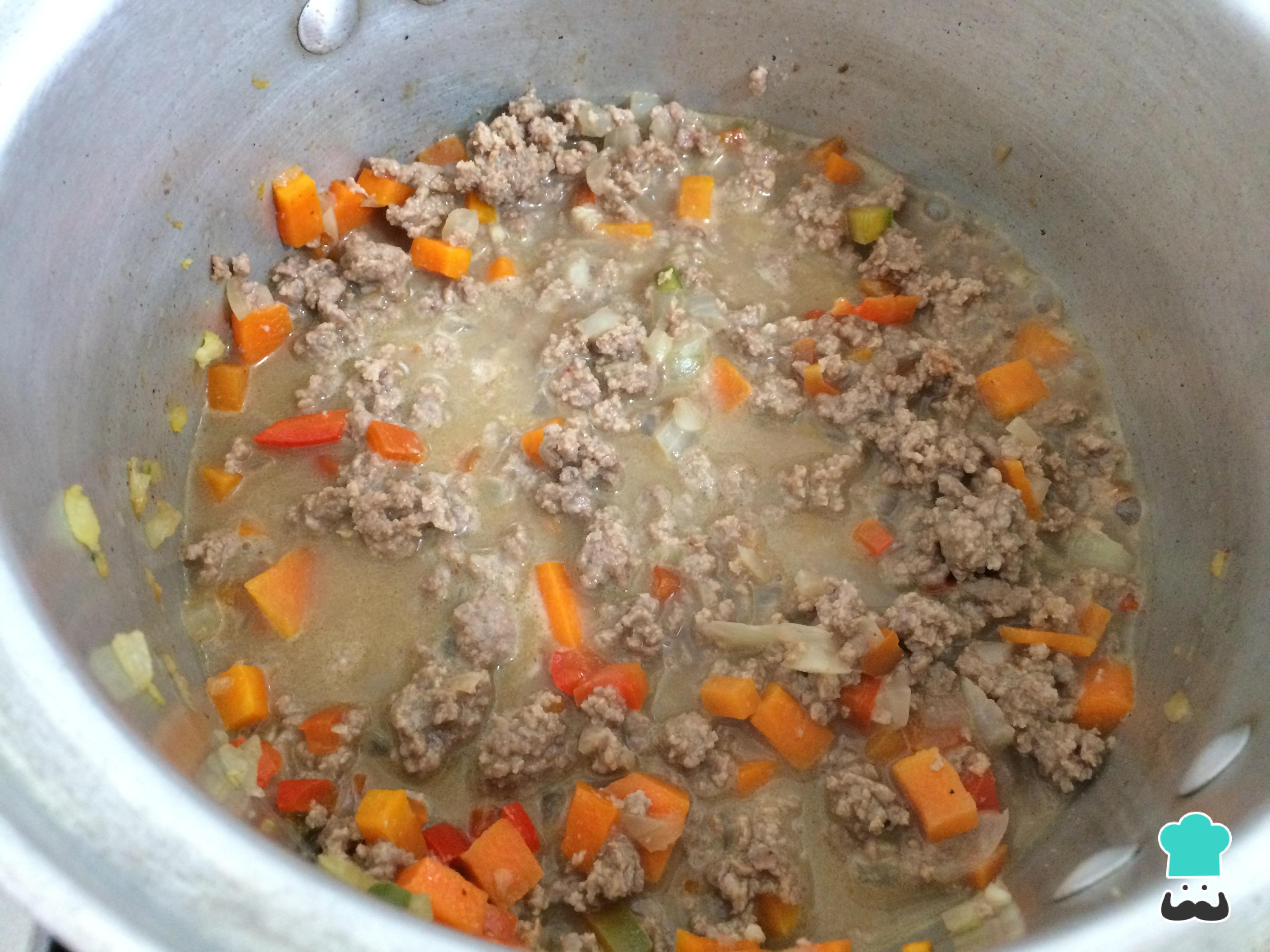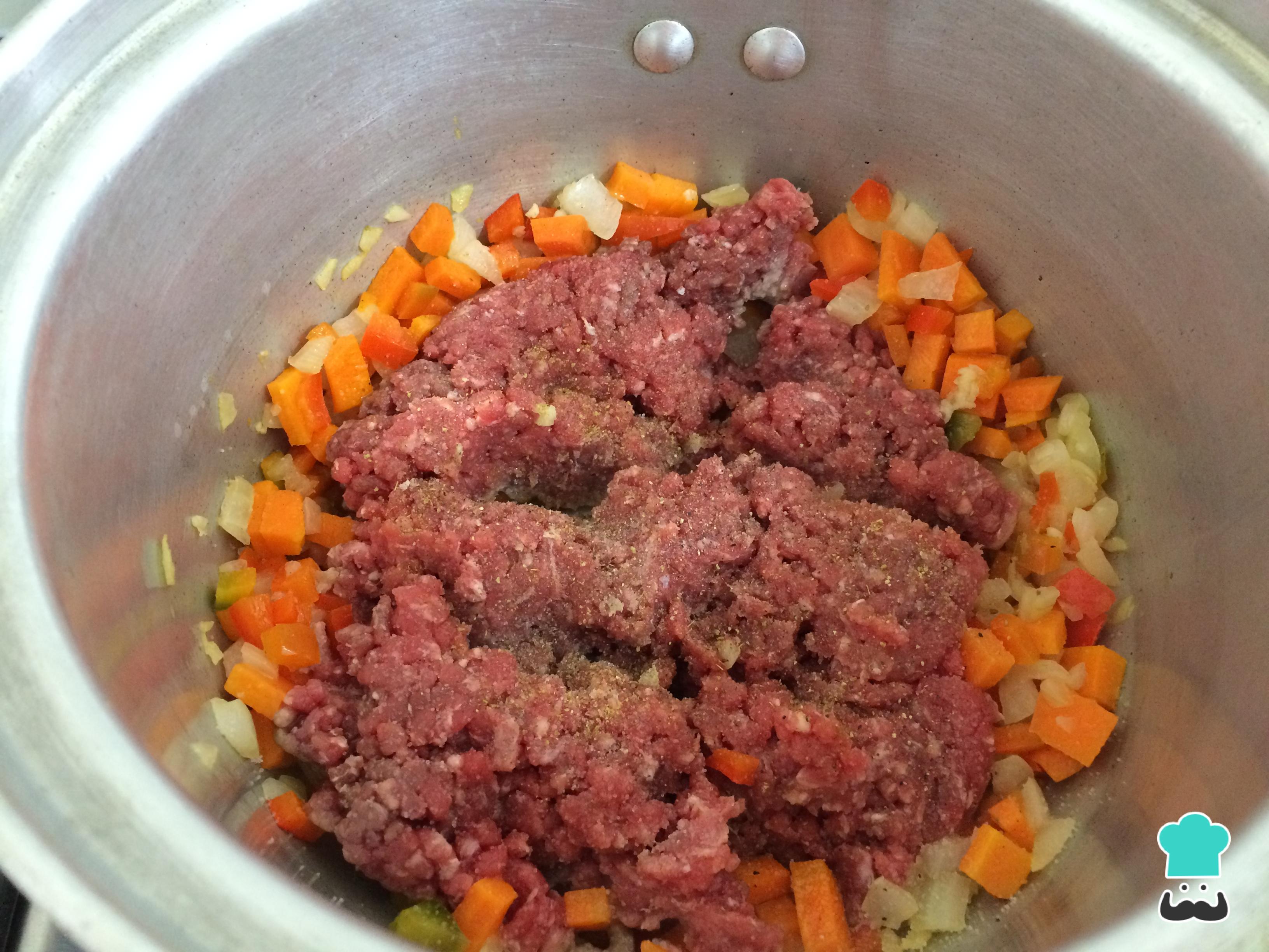 A continuación, agrega la carne molida y sazona con comino en polvo. Sofríe por unos minutos más.