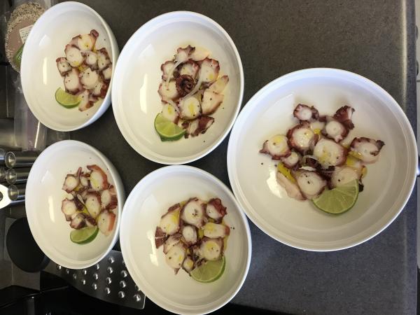 Lleva el pulpo cocido al congelador, una vez esté congelado córtalo en láminas lo más finas posibles e introduce en el fondo del plato donde vamos a servir nuestro carpaccio de pulpo. Adiciona el zumo de un limón encima de cada preparación. Ten en cuenta que el pulpo debe acabar de cocinarse en el mismo jugo de limón.