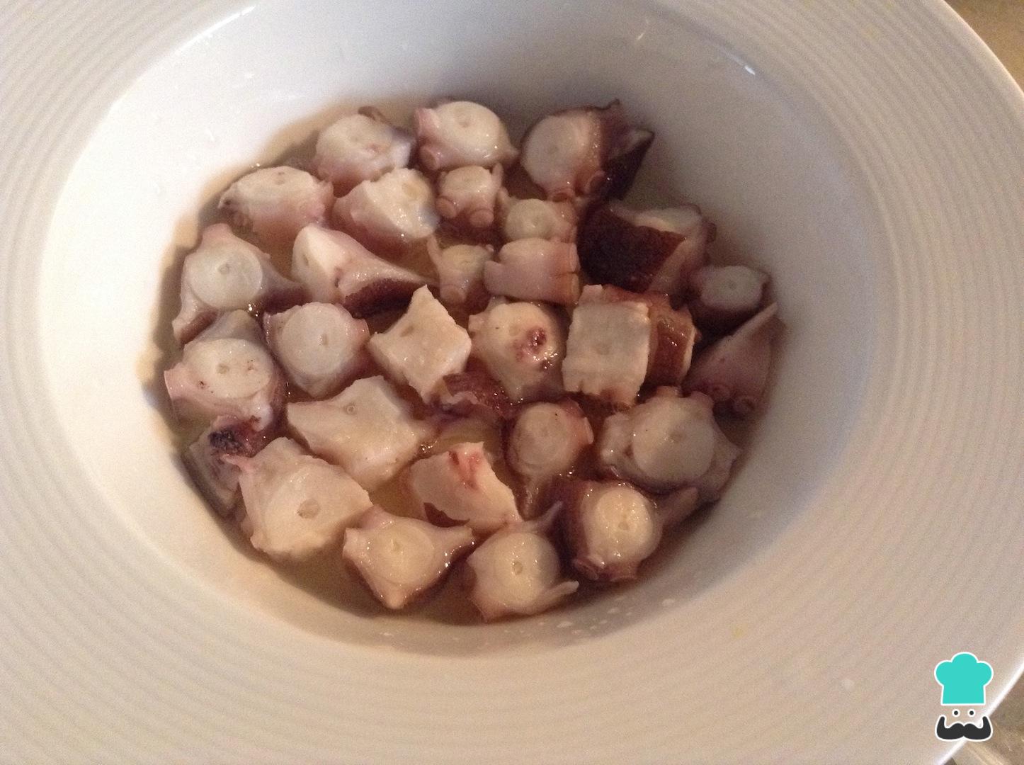 El primer paso para realizar la receta de pulpo es prealistar los ingredientes. Si quieres, puedes reemplazar la pimienta negra por pimienta rosada para hacer el plato un poco más elegante.