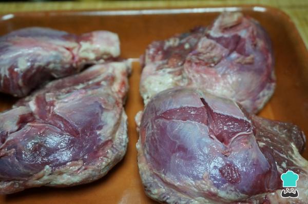Después vamos a trocear las carrilleras de cerdo haciendo trozos de tamaño similar, con aproximadamente unos 3 centímetros de grosor.