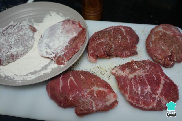 Para empezar con la receta de carrilleras de cerdo guisadas o estofadas, primero coloca una cazuela o una olla con un buen chorro de aceite de oliva a fuego fuerte. A continuación, limpia las carrilleras del exceso de grasa y telillas. Luego, salpimienta las carrileras y pasa por harina.