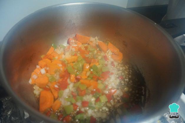Lava y pica las verduras. En la misma olla de dorar las carrilleras, añade un poco más de aceite e incorpora las verduras, deja 5 minutos que se pochen a fuego medio. Pasado el tiempo, añade el tomate frito y remueve todo bien.