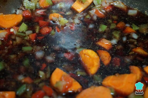 Añade el vino tinto y deja que se reduzca el alcohol.