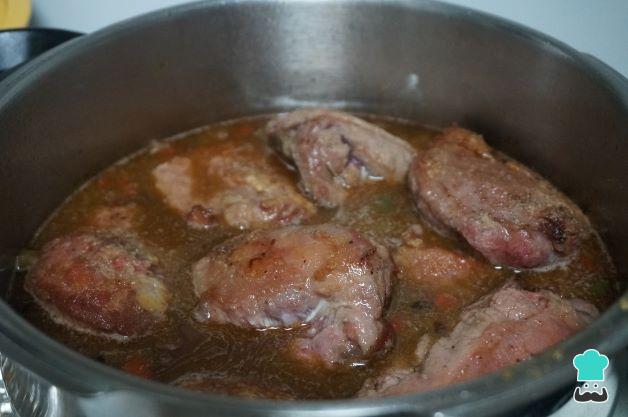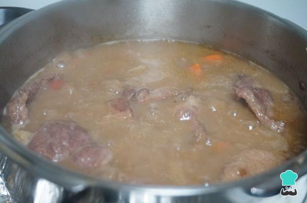 Añade el caldo o agua y coloca las carrileras de cerdo. Si no quedan cubiertas por el líquido, debes añadir más caldo o agua. Por otro lado, si no tienes caldo puedes añadir una pastilla de caldo para proporcionar más sabor.