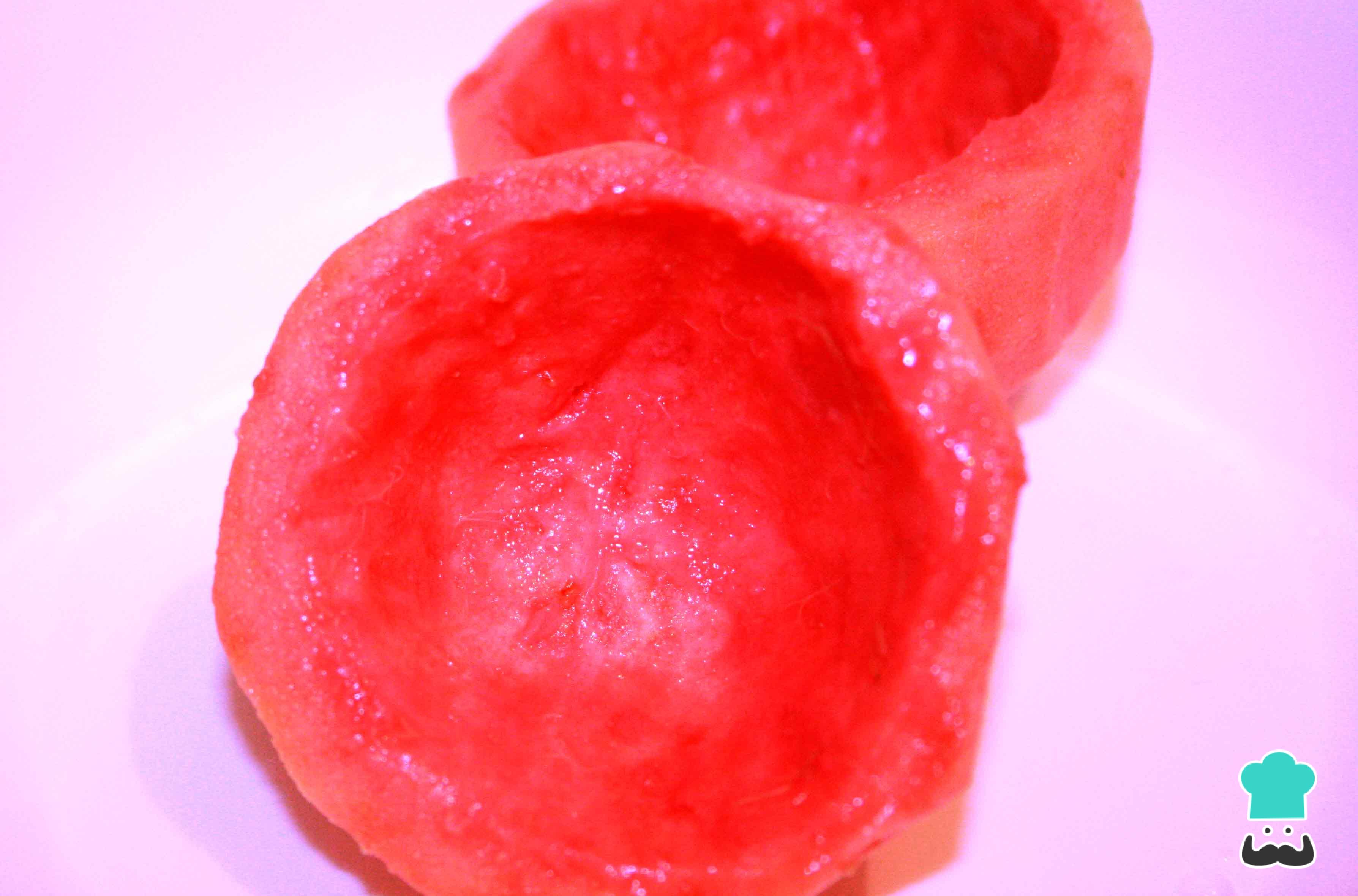 Para hacer los cascos de guayaba, corta las frutas a la mitad y retira la pulpa con una cuchara. Procura no extraer más de lo necesario o los cascos quedaran muy delgados y pueden romperse al cocinarlos. Reserva la pulpa y los casquitos de guayaba por separado.