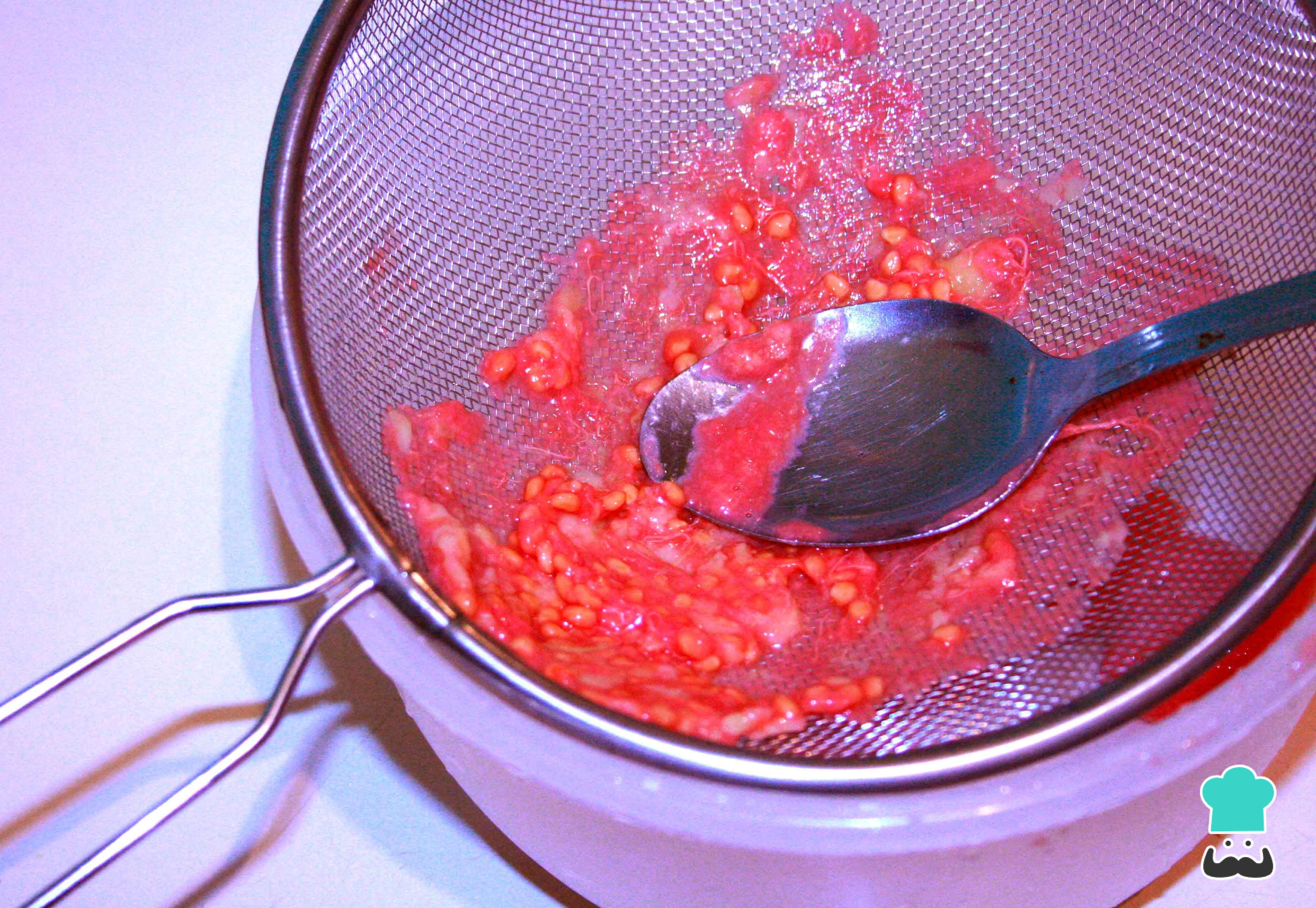 La guayaba tiene muchas semillas, así que para eliminar las semillas de la pulpa, vaciamos el el puré en un colador y desechamos que lo no pase por la malla. Reservamos la pulpa para el dulce de guayaba.