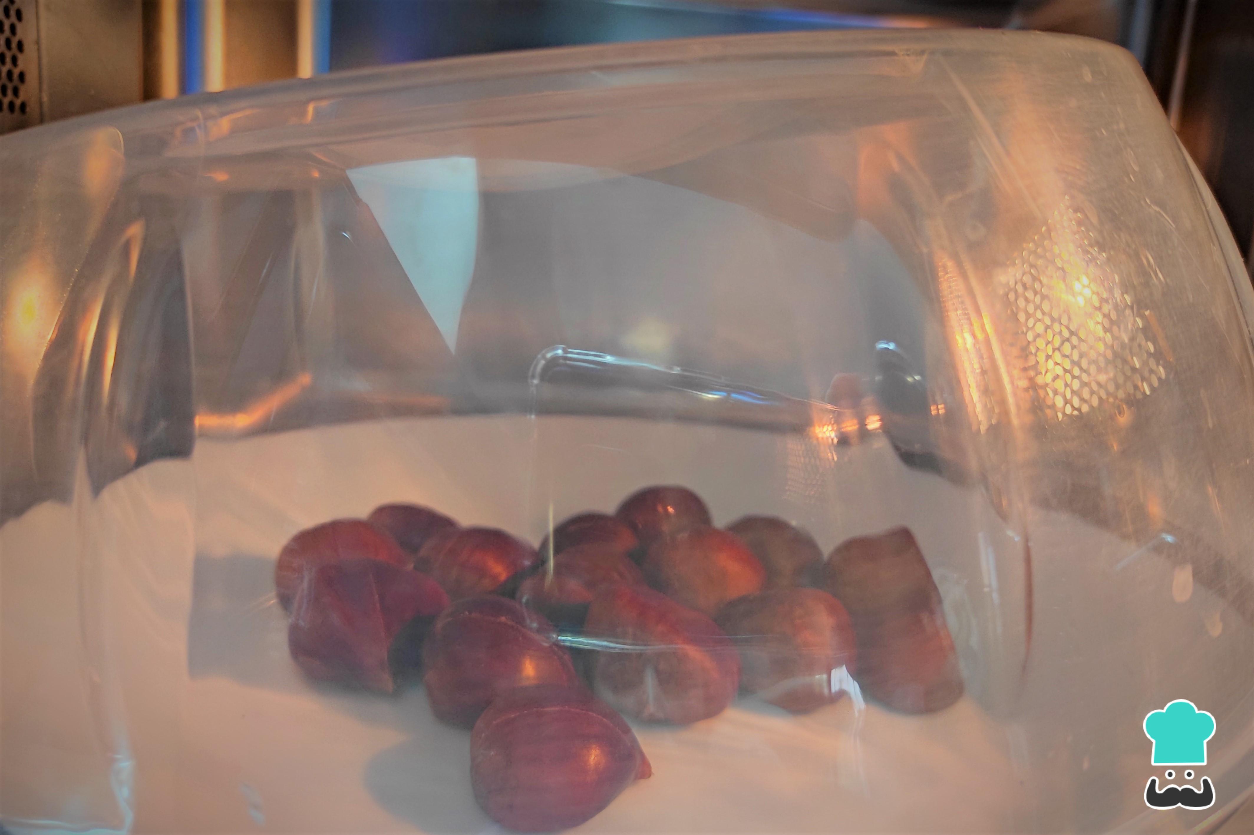 Con cuidado de no quemarte, saca las castañas del microondas de inmediato y tápalas con un paño de cocina, para evitar que lleguen a enfriarse, se vuelvan a endurecer y cueste quitar su piel.