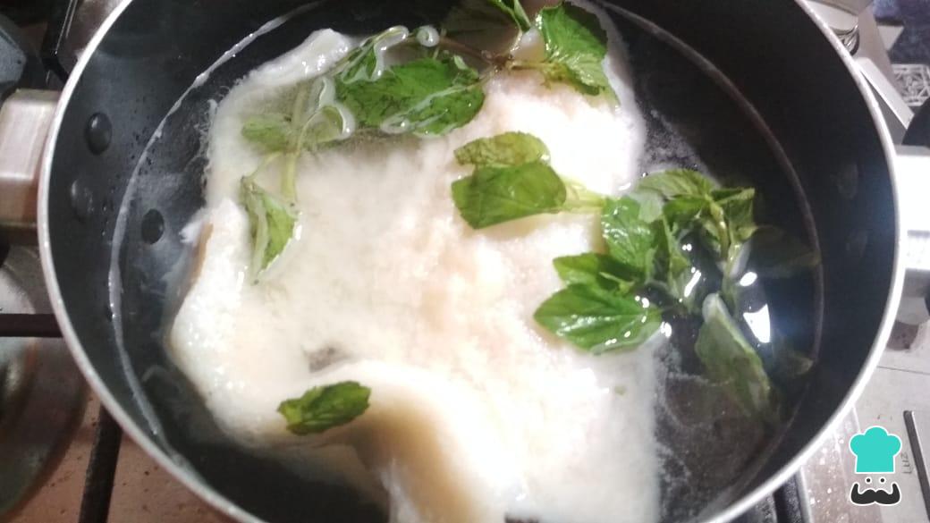 Para empezar, pasa por agua fría el mondongo entero para lavarlo. Luego, colócalo en una olla pequeña, cúbrelo con agua y añade unas ramitas de hierbabuena y una pizca de sal. Hierve el mondongo por 10 minutos.