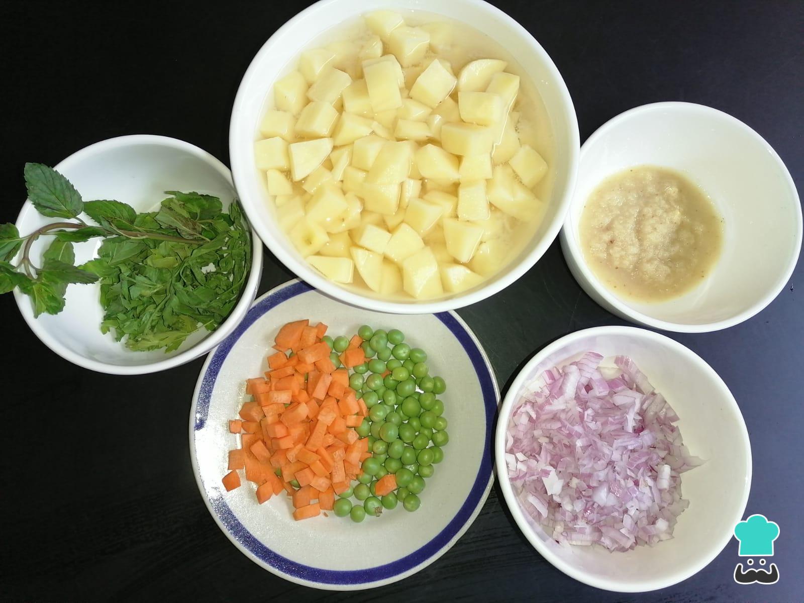 Mientras se va cocinando el mondongo, prepara las verduras. Así, pica la cebolla, prepara el ajo molido, pela y corta la papa rosada en cuadrados de aproximadamente 1 centímetro, desgrana las alverjas y pica la zanahoria en cuadraditos.