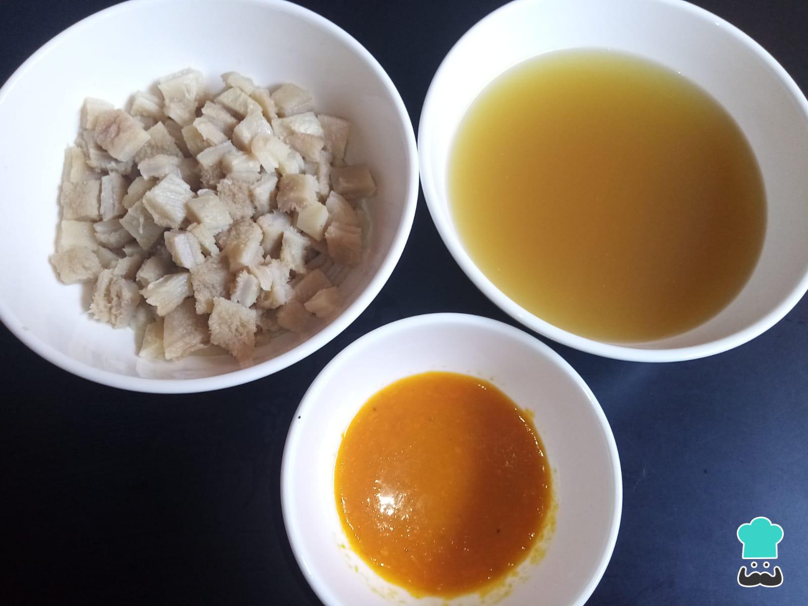 Pasados los 10 minutos de la primera cocción del mondongo, apaga el fuego y retira el mondongo del agua para picarlo en cuadraditos de casi 1 centímetro, tratando de obtener el tamaño de la papa. También deberás reservar el caldo de la cocción. Aprovecha para medir la pasta de ají amarillo.