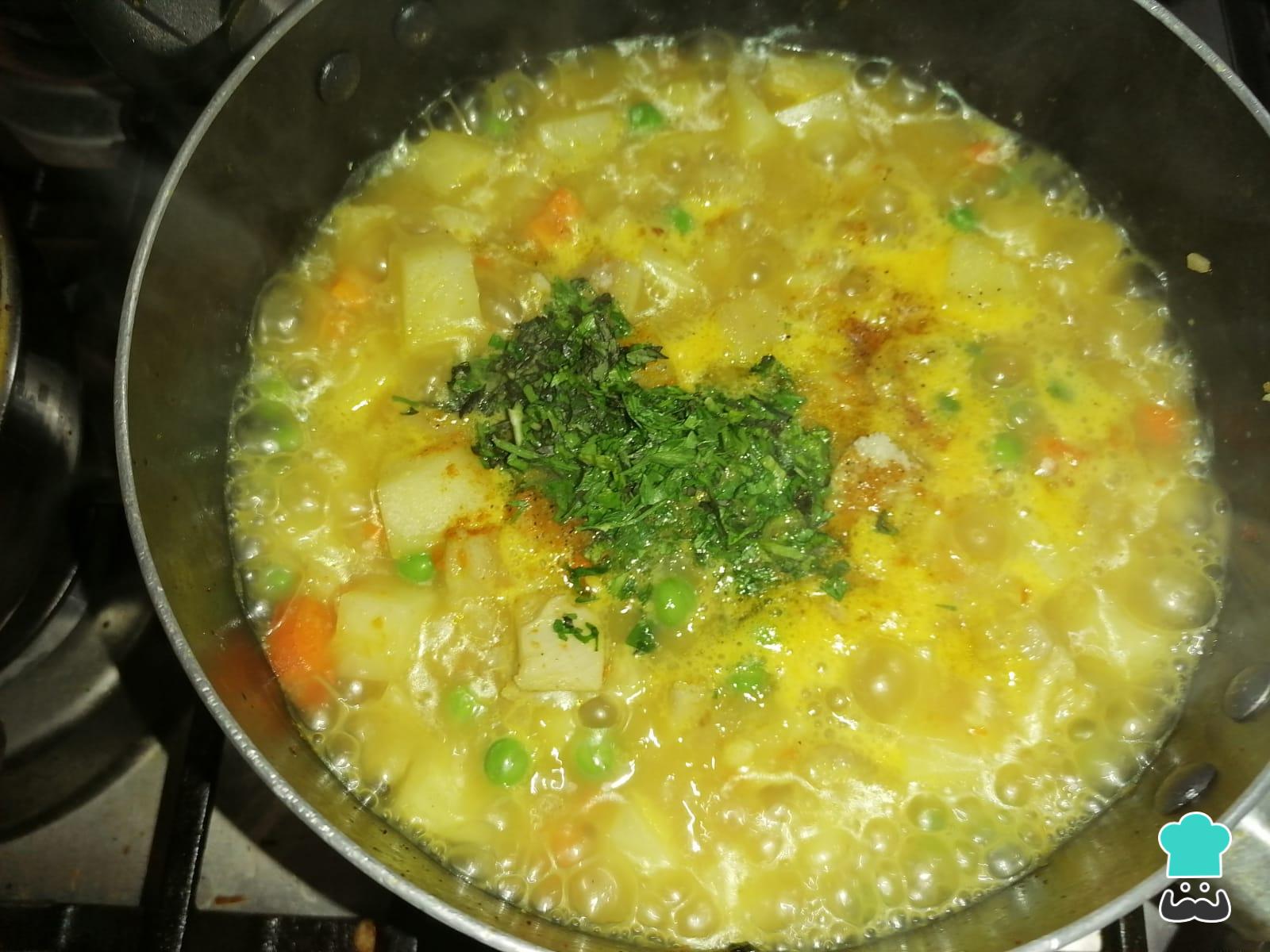 Pasados los 5 minutos, echa al guiso la zanahoria y la alverjita. Pica un poco de hierbabuena y perejil y aromatiza la preparación con estos condimentos. Si ves que el líquido se está reduciendo demasiado, agrega un poco más del caldo de la cocción del mondongo.