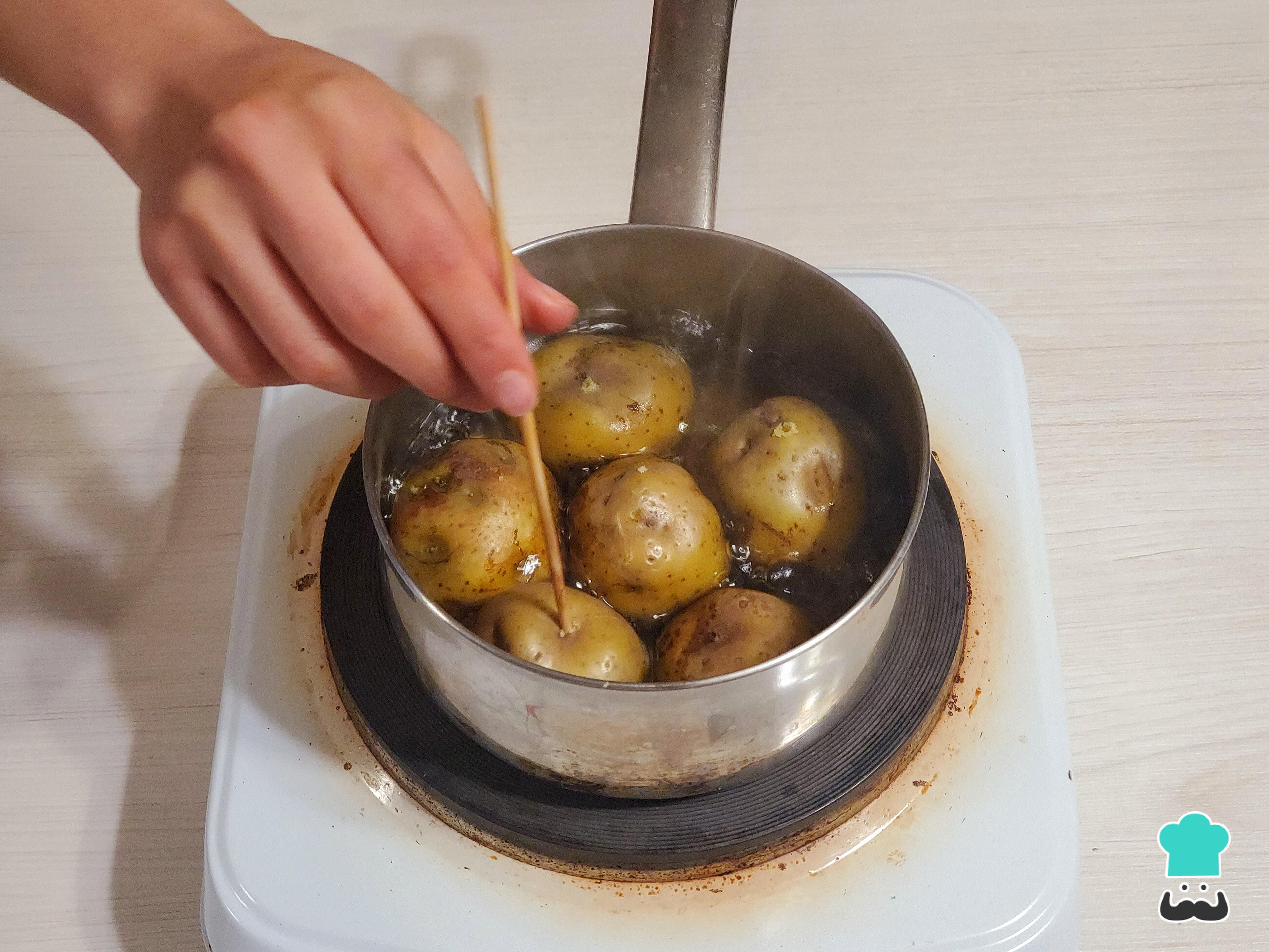 Sancocha las papas amarillas. Para hacerlo, colócalas en una olla, cúbrelas con agua fría, añade un buen puñado de sal, tapa y deja hervir a fuego bajo hasta que estén suaves. Para saber si están listas, puedes incrustar una brocheta; si entra suavemente, retíralas inmediatamente del agua para evitar que se abran.