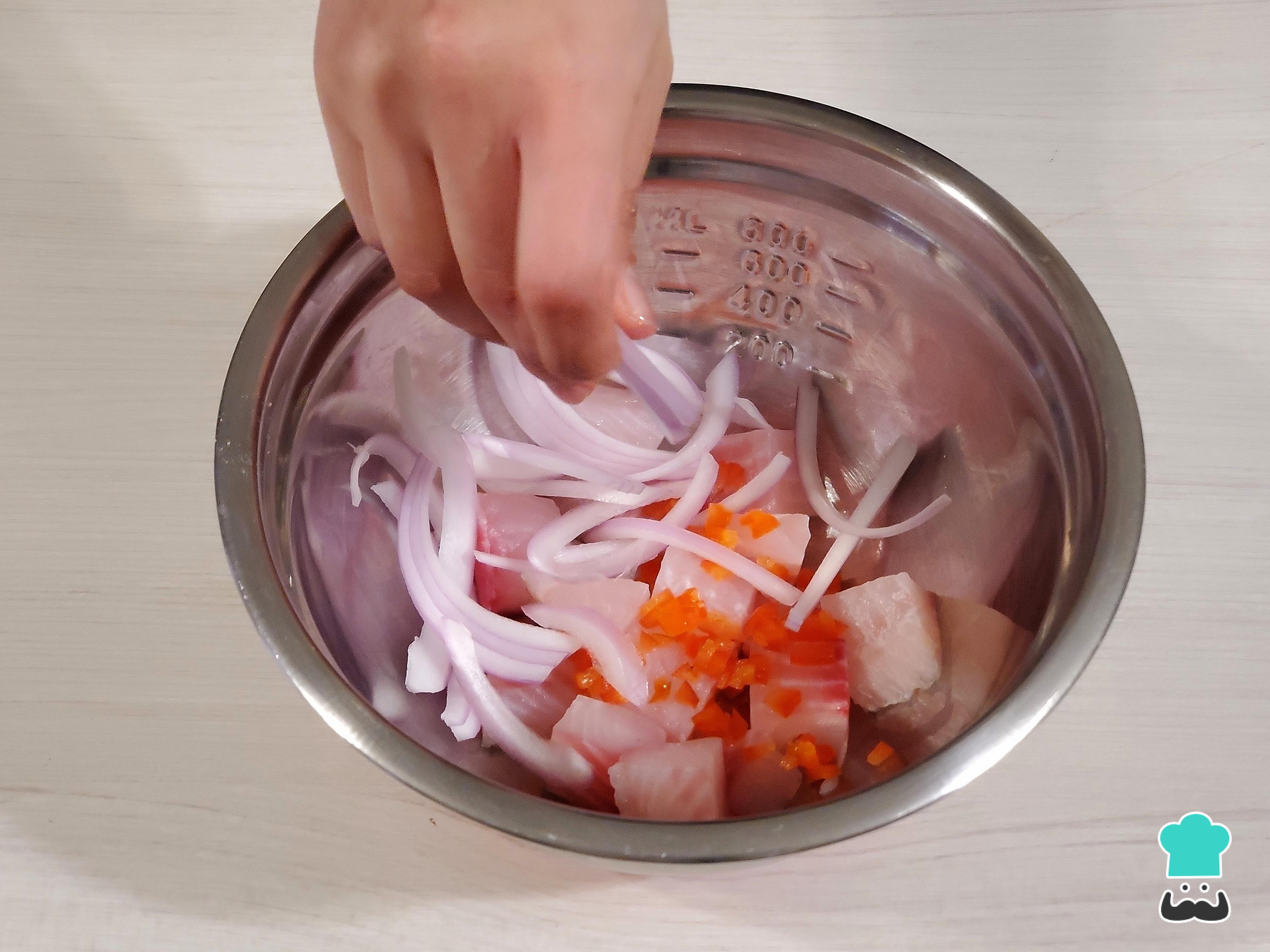 Agrega culantro y ají limo, ambos finamente picados, al bowl del pescado y añade un poco de la cebolla en pluma. Remueve bien.