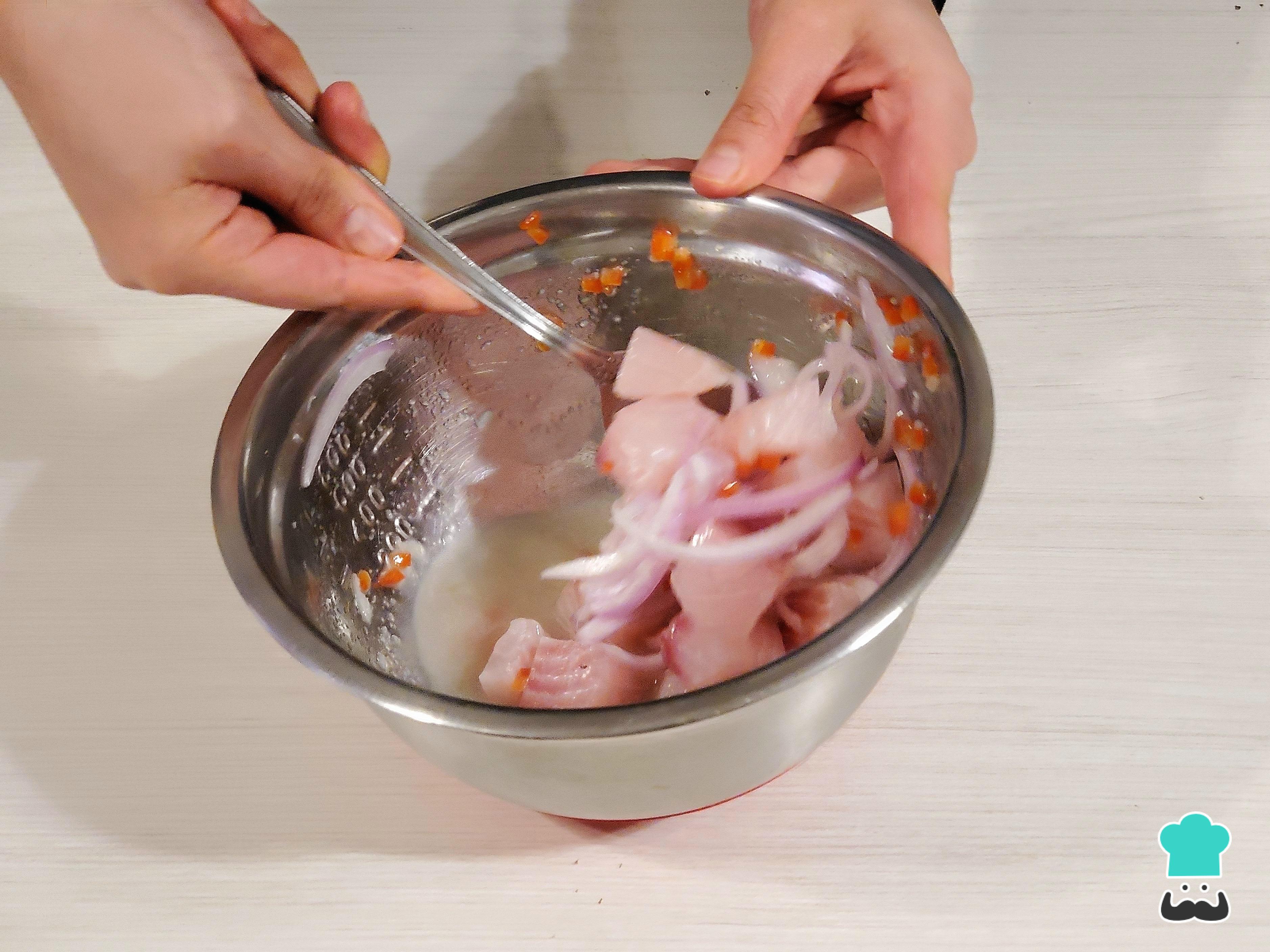 Termina el ceviche agregando un buen chorro de leche de tigre y el jugo de limón. Rectifica la sazón.