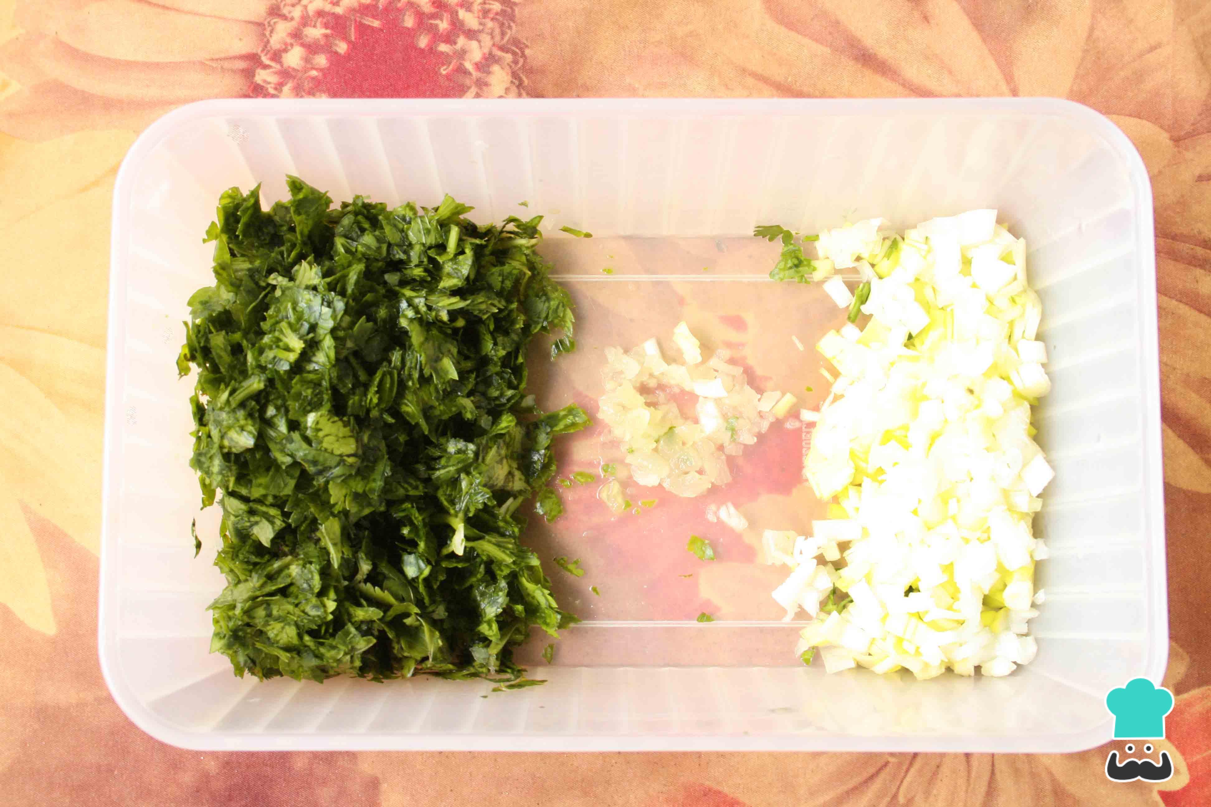 Corta en cuadros pequeños el cebollín. Mientras que el perejil y el ajo deben picarse más finamente. Reserva por separado.