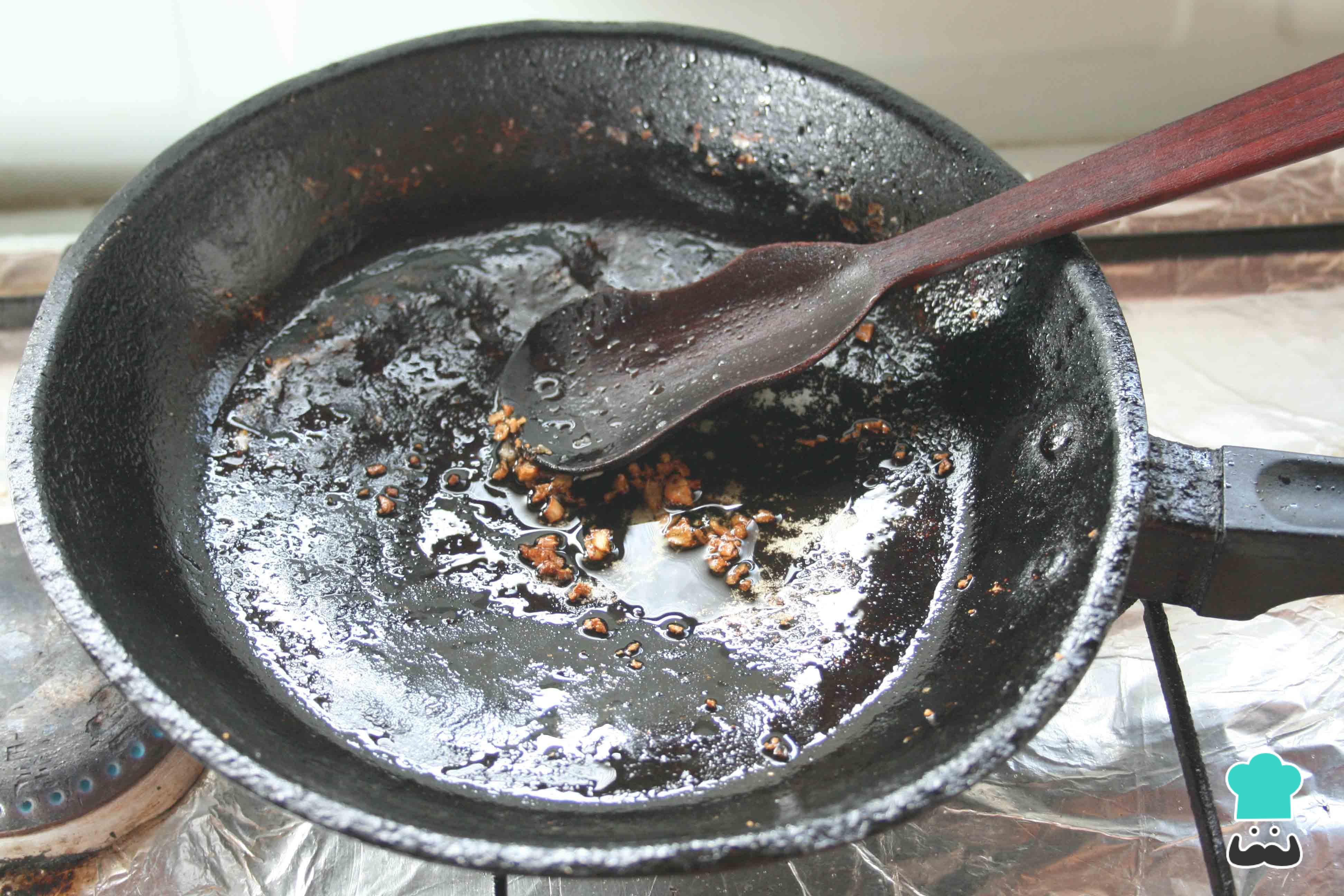 Dentro de un caldero o sartén, vierte el aceite de oliva y luego el laurel. Cuando el aceite esté caliente agrega los ajos. Cocina a fuego medio y remueve constantemente.