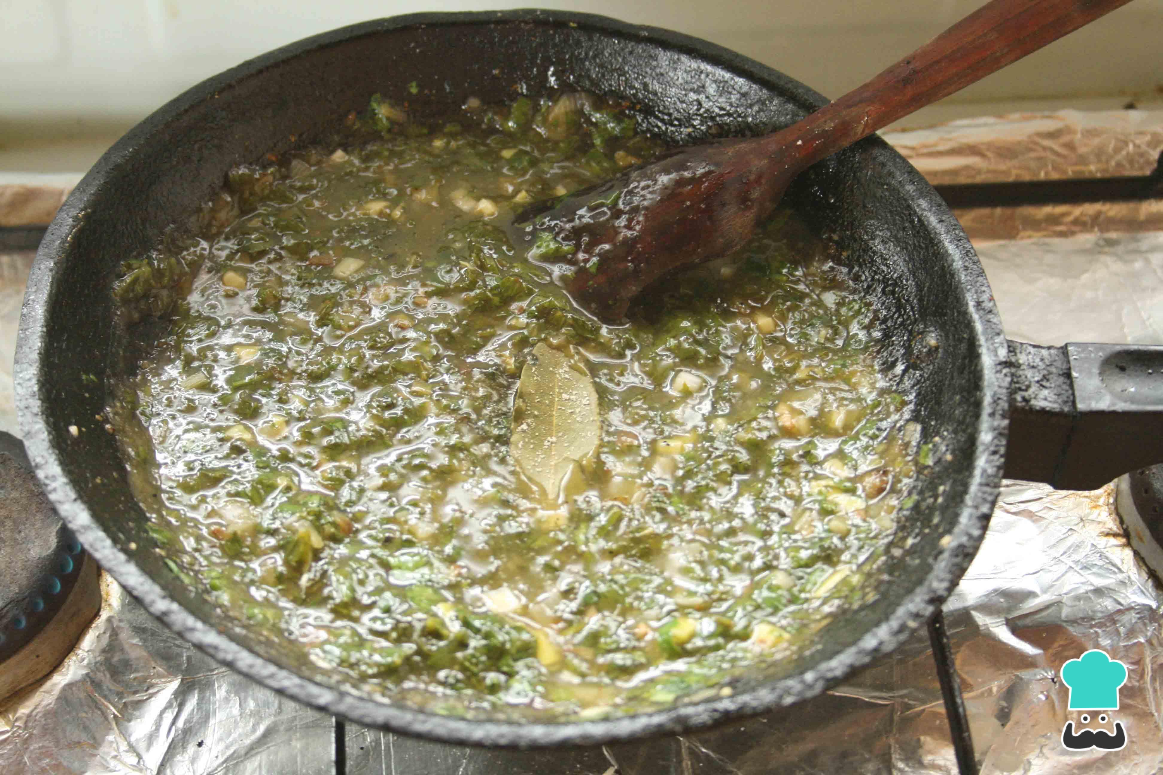 Cuando sientas el aromático olor del ajo es tiempo de incorporar la cebolleta. Agrega una pizca de sal para que sude. Remueve de vez en vez.