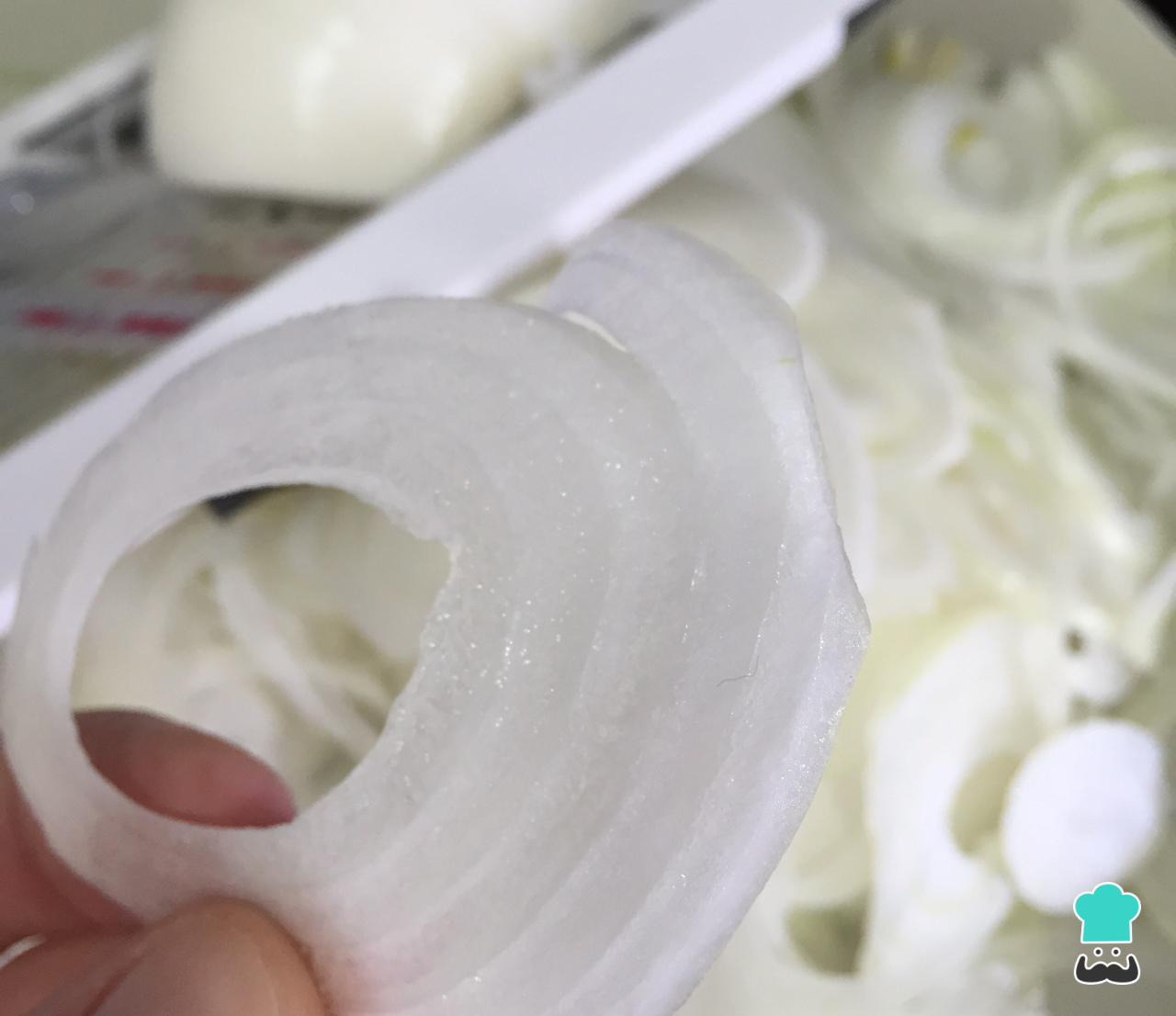 Lo primero que vamos a hacer es pelar las cebollas y cortarlas al gusto. Se recomienda hacer trozos pequeños o finos. En este caso hemos optado por hacer láminas finas.