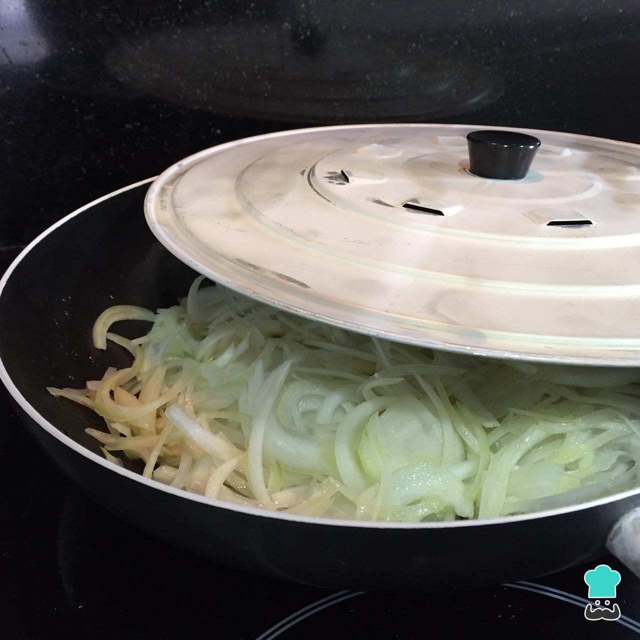Echamos el chorrito de aceite en la sartén y agregamos la cebolla cuando esté caliente. Vamos a cocinar durante toda la receta a fuego medio. Tendremos la cebolla en la sartén entre 20 y 25 minutos tapada e iremos destapando solamente para mover y asegurarnos de que no se pegue (es difícil a fuego medio-bajo).